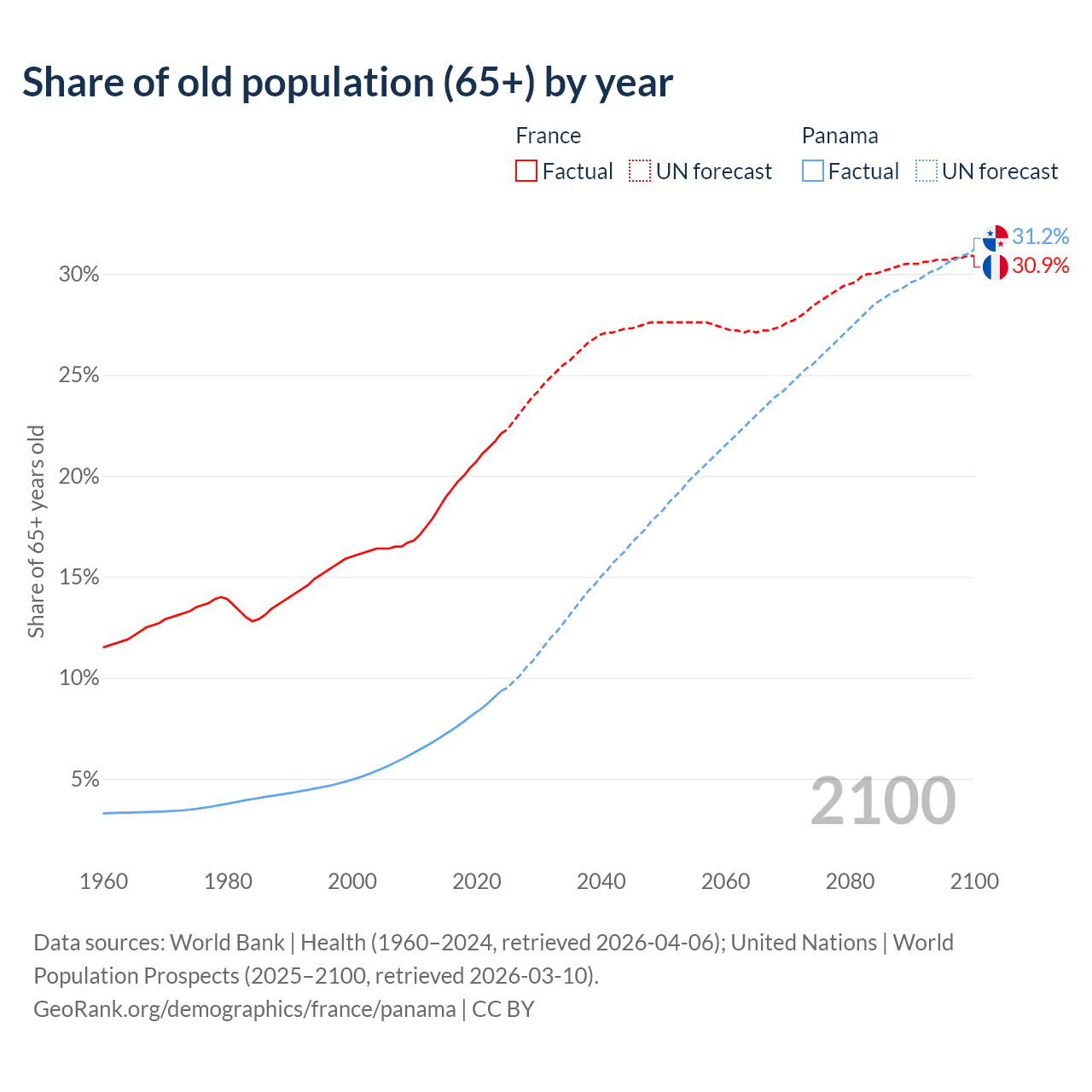 - The share of old-age demographic (65+) in France is 22.1% vs 9.35% in Panama.