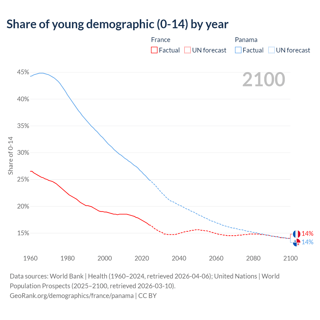 - The share of young demographic (0-15 years old) in France is 16.5% vs 24.9% in Panama.