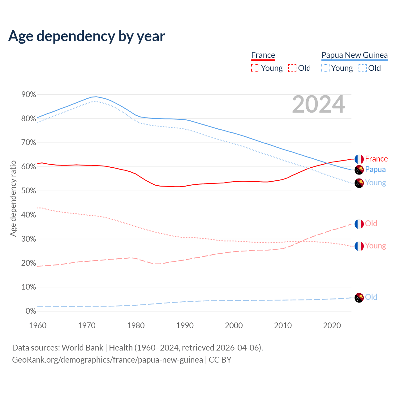 - France is ranked 29/196 by median age (oldest to youngest) vs 140/196 for Papua New Guinea.