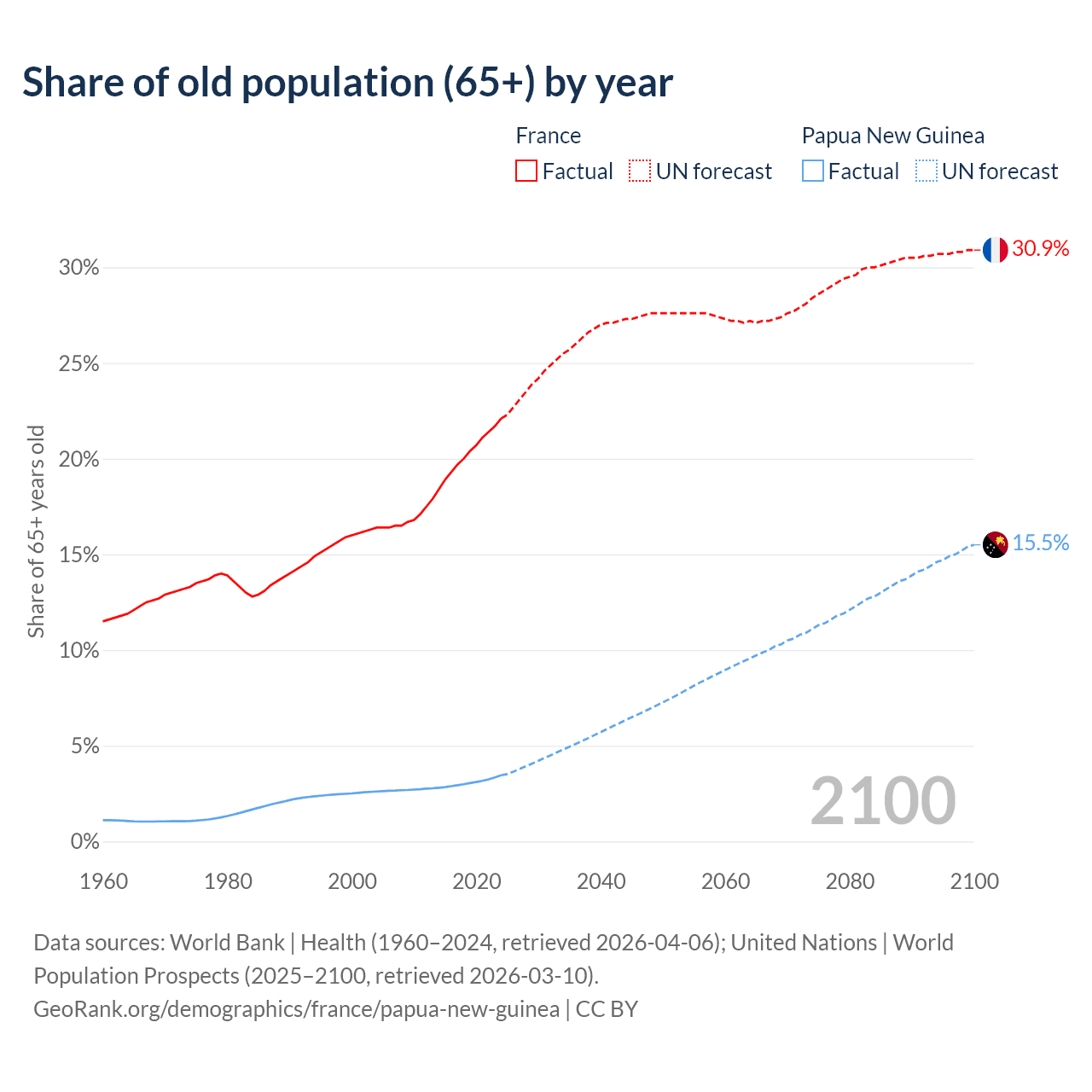 The share of older people aged 65 and over is 22.1% in France and 3.46% in Papua New Guinea. Life expectancy in France compared to Papua New Guinea .