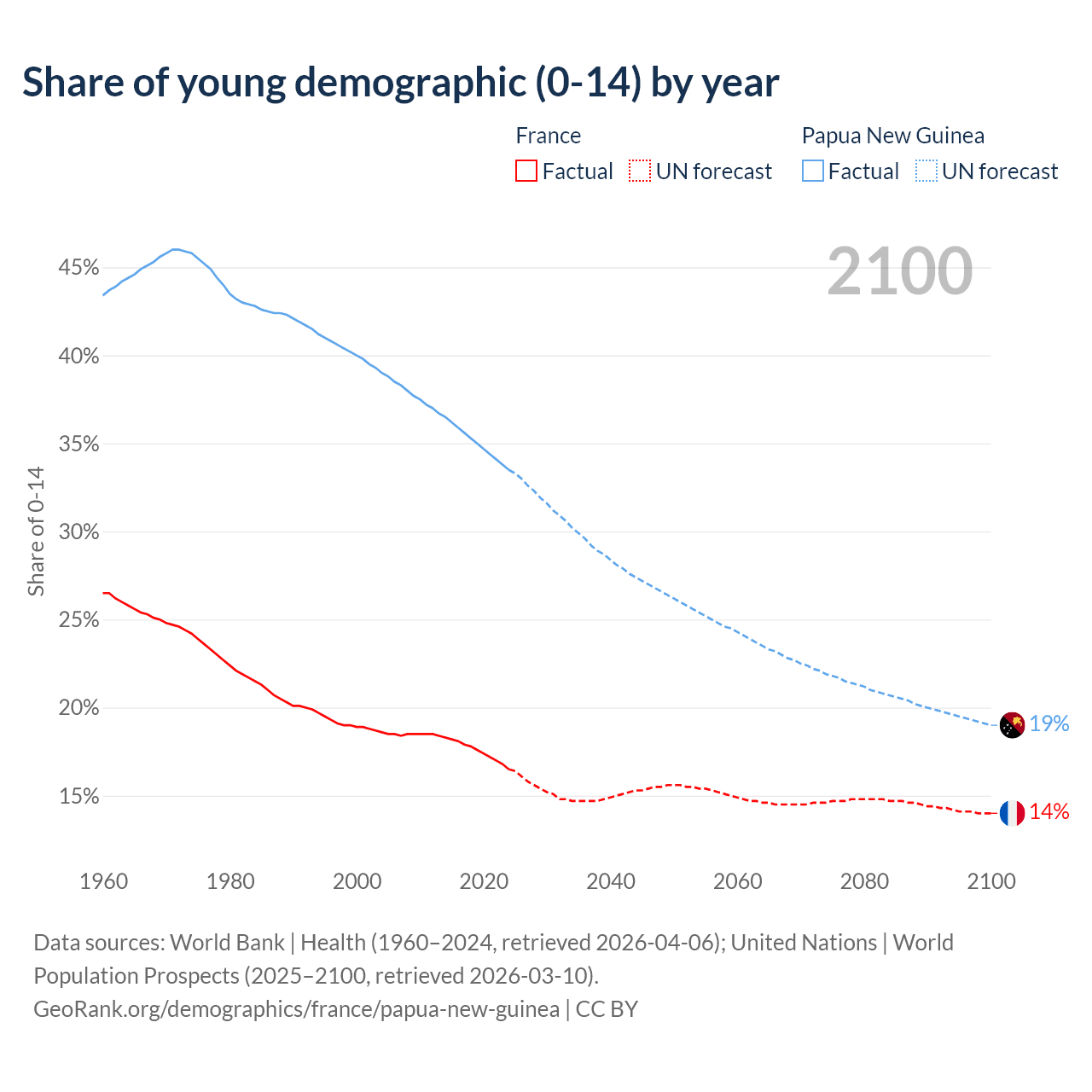- The share of young demographic (0-15 years old) in France is 16.5% vs 33.5% in Papua New Guinea.