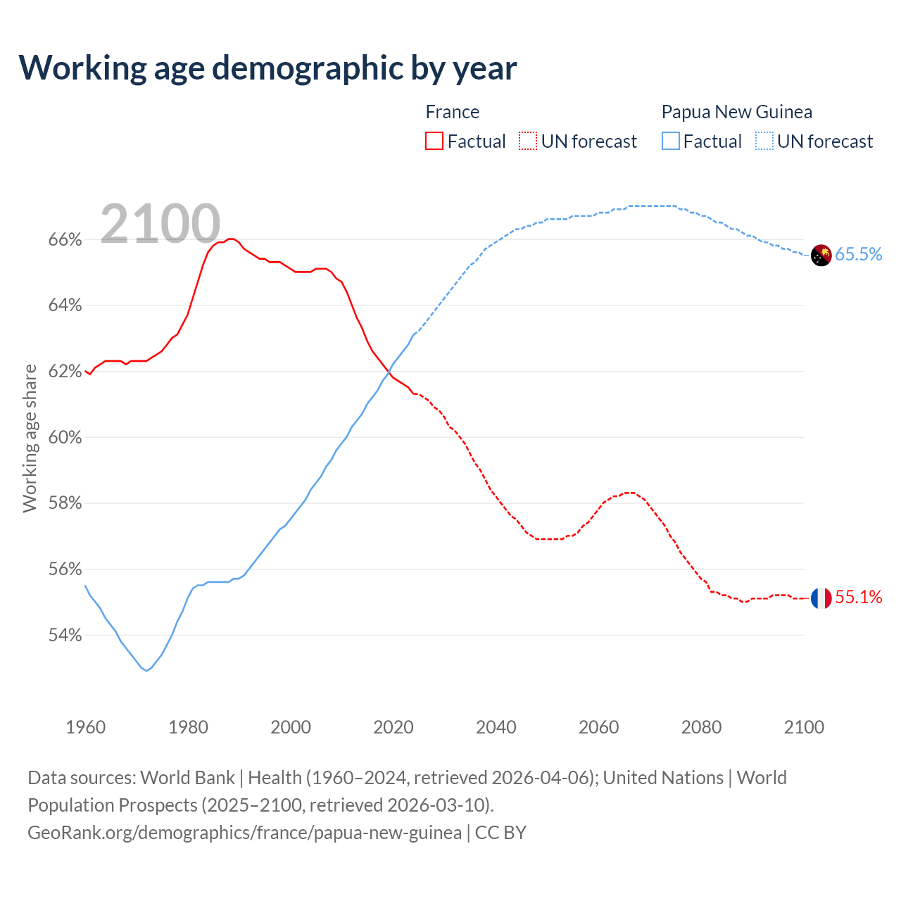 - France has 42.2M working age adults (aged 15-64) vs 6.94M in Papua New Guinea.