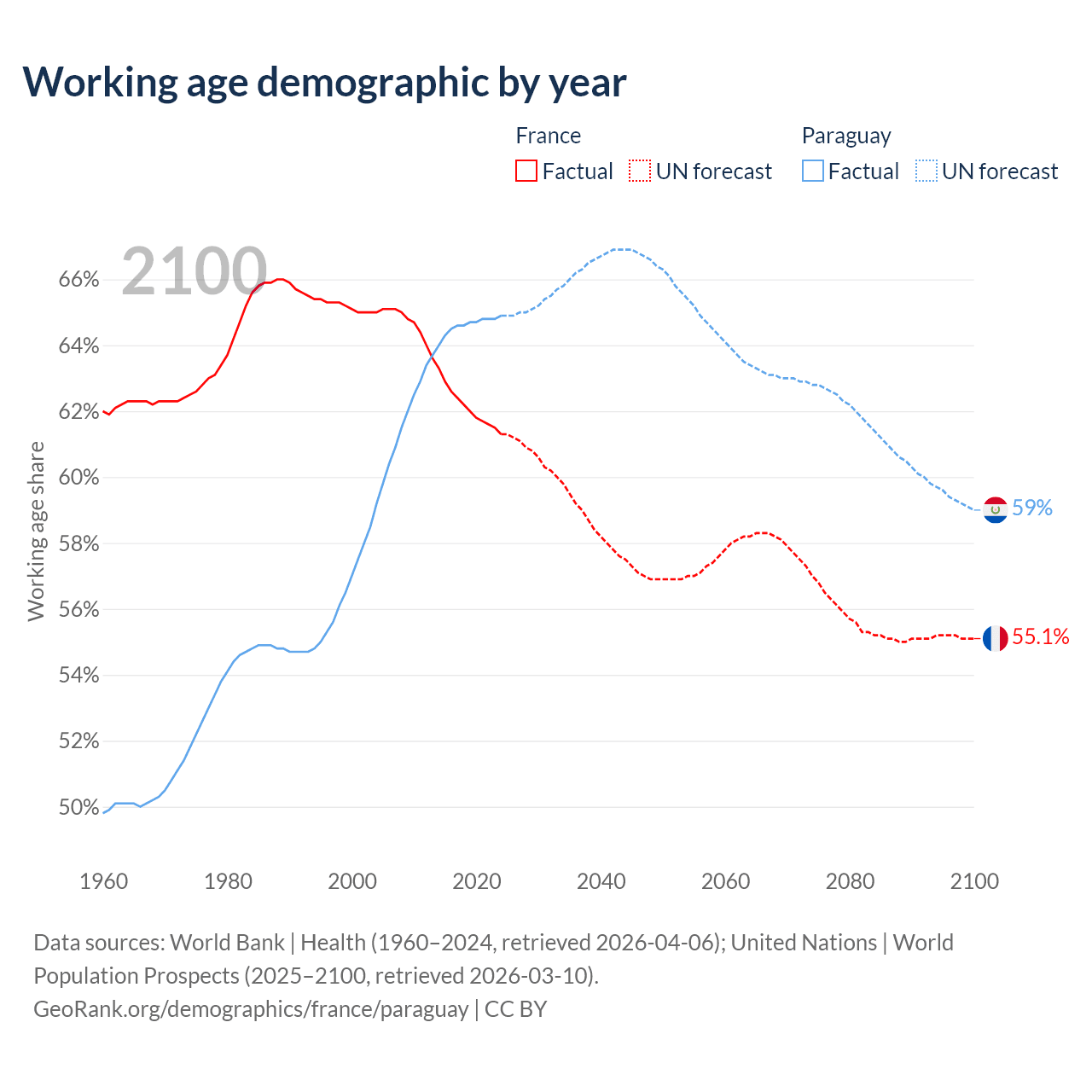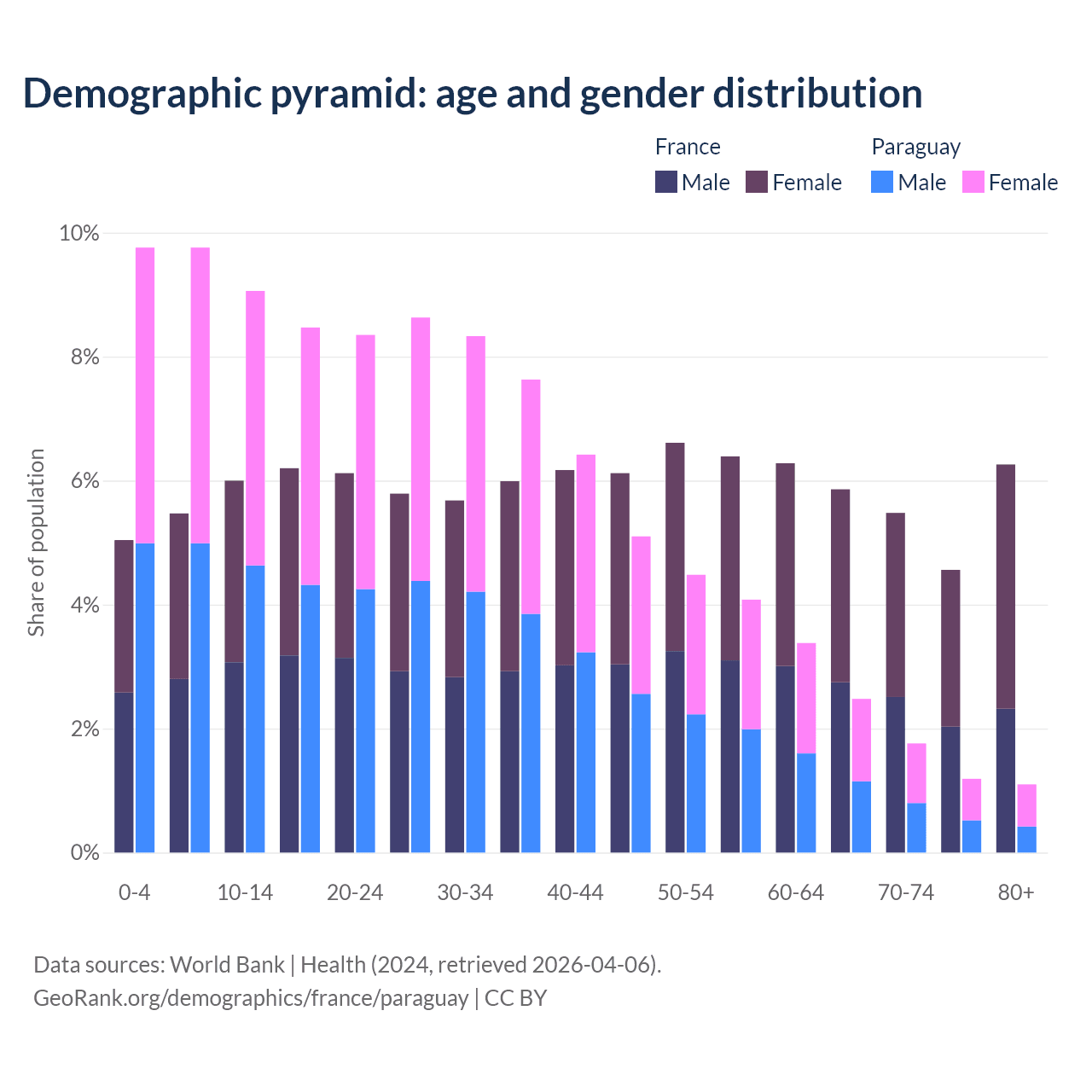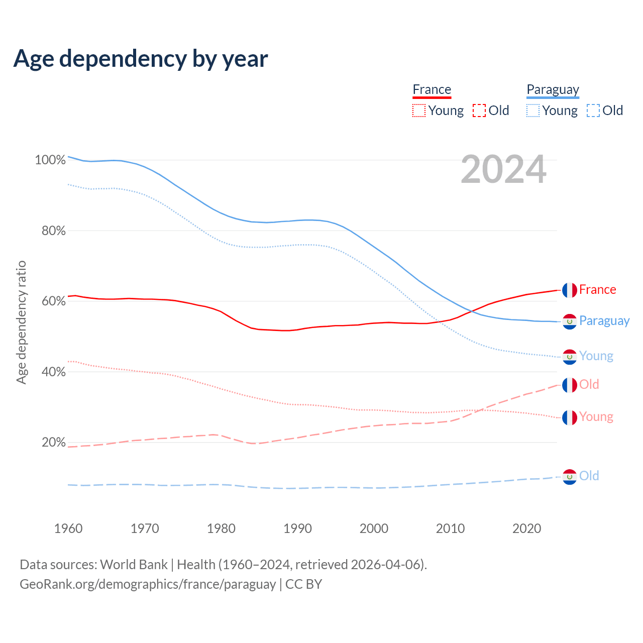 - The share of old-age demographic (65+) in France is 22.1% vs 6.54% in Paraguay.