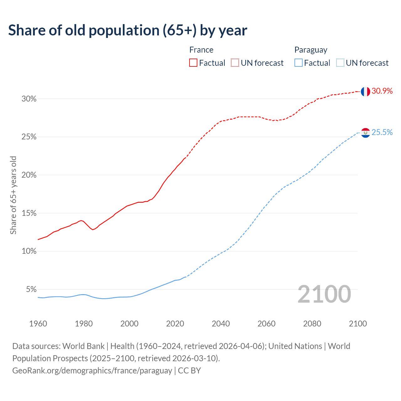 The share of older people aged 65 and over is 22.1% in France and 6.54% in Paraguay. Life expectancy in France compared to Paraguay .