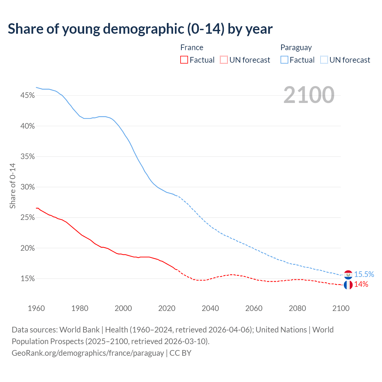 - The share of young demographic (0-15 years old) in France is 16.5% vs 28.6% in Paraguay.