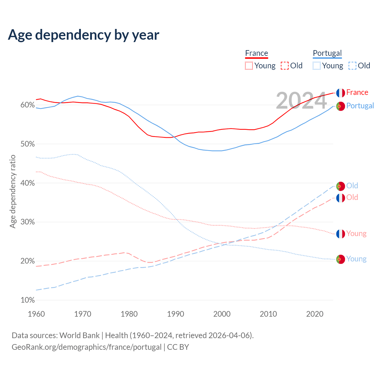 Data sources: World Bank | Health (1960–2024, retrieved 2026-04-06); U.S. Census Bureau (1960–2024, retrieved 2026-02-08).