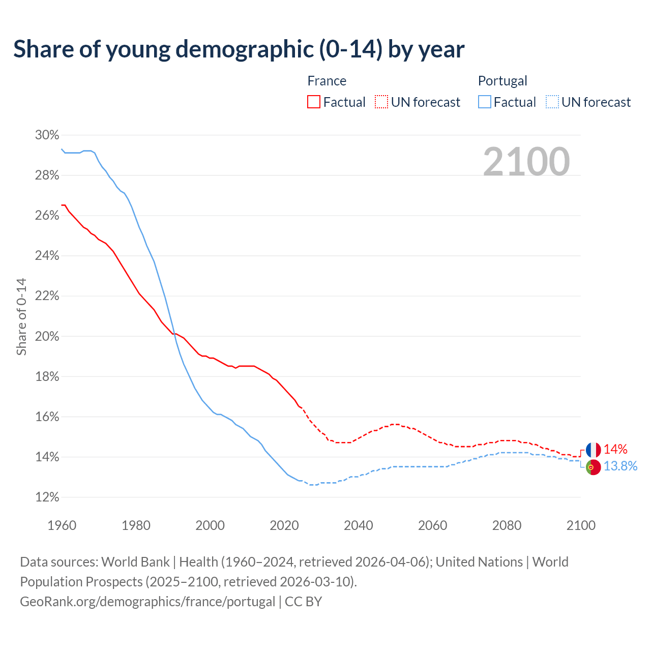 - The share of young demographic (0-15 years old) in France is 16.5% vs 12.8% in Portugal.
