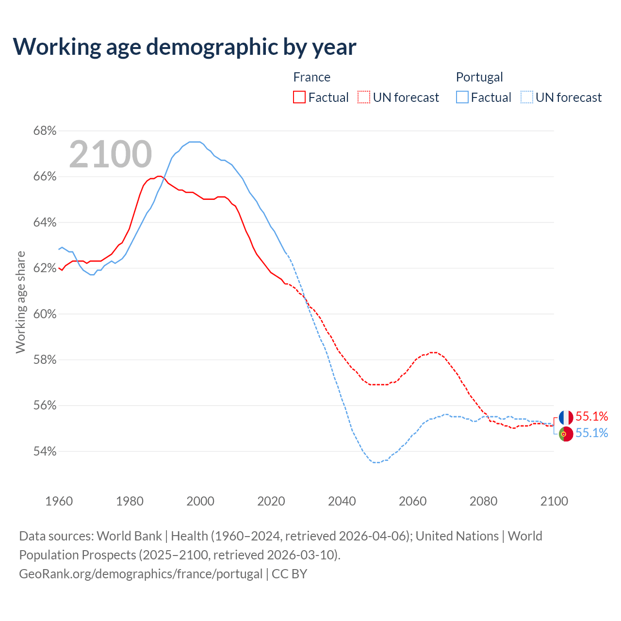 Median age France vs Portugal, 1960-2100