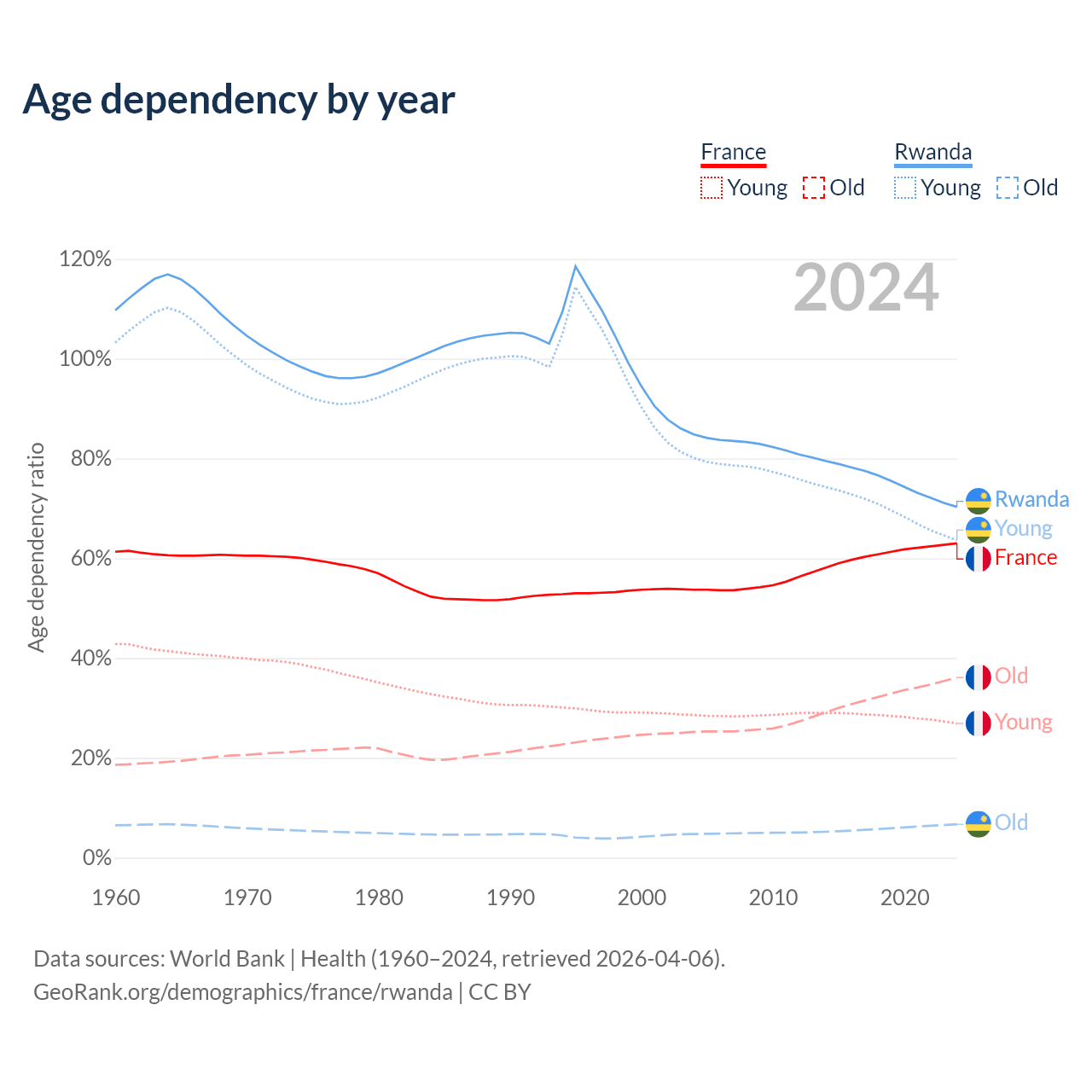 - France is ranked 29/196 by median age (oldest to youngest) vs 160/196 for Rwanda.