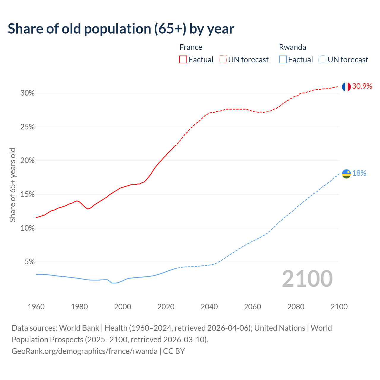 - The share of old-age demographic (65+) in France is 22.1% vs 3.93% in Rwanda.