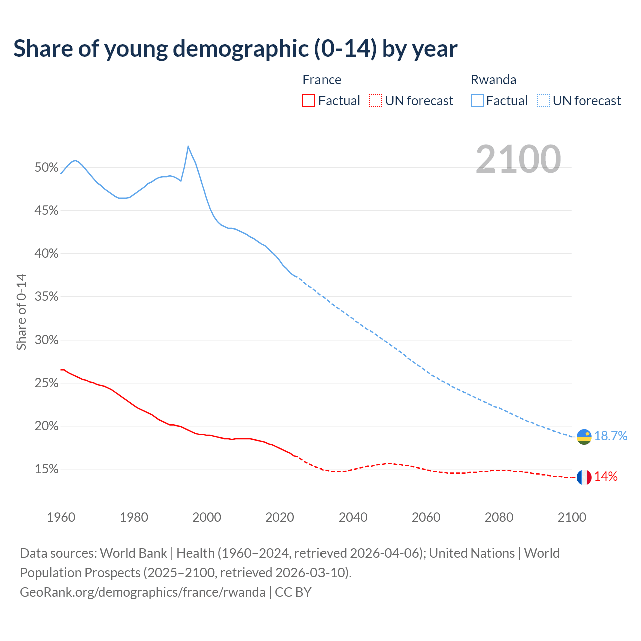 - The share of young demographic (0-15 years old) in France is 16.5% vs 37.4% in Rwanda.