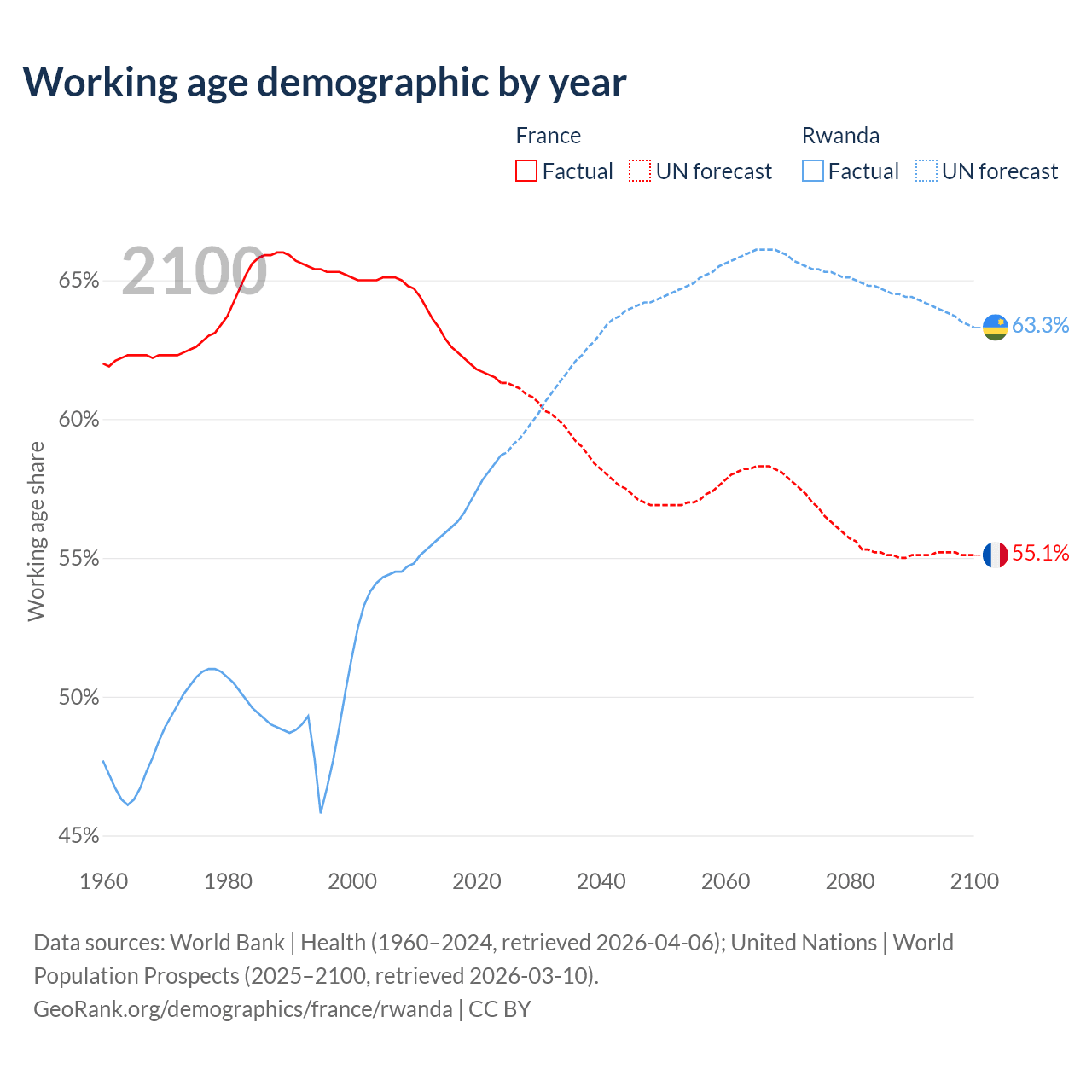 - France has 42.2M working age adults (aged 15-64) vs 8.79M in Rwanda.