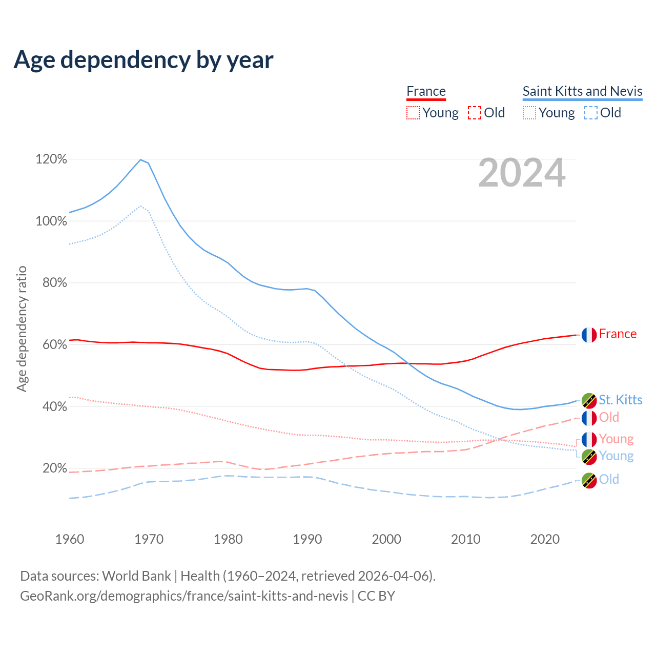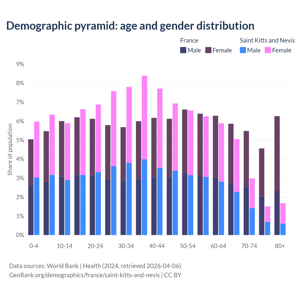 - France is ranked 29/196 by median age (oldest to youngest) vs 69/196 for Saint Kitts and Nevis.