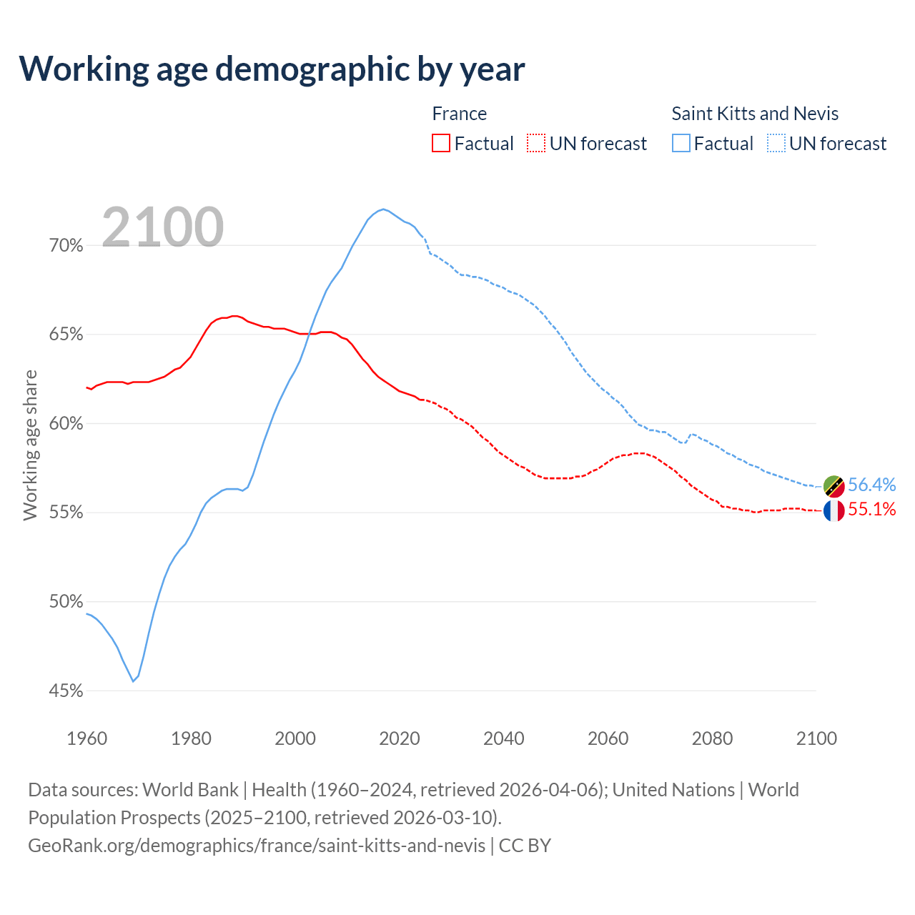 - The share of young demographic (0-15 years old) in France is 16.5% vs 18.2% in Saint Kitts and Nevis.