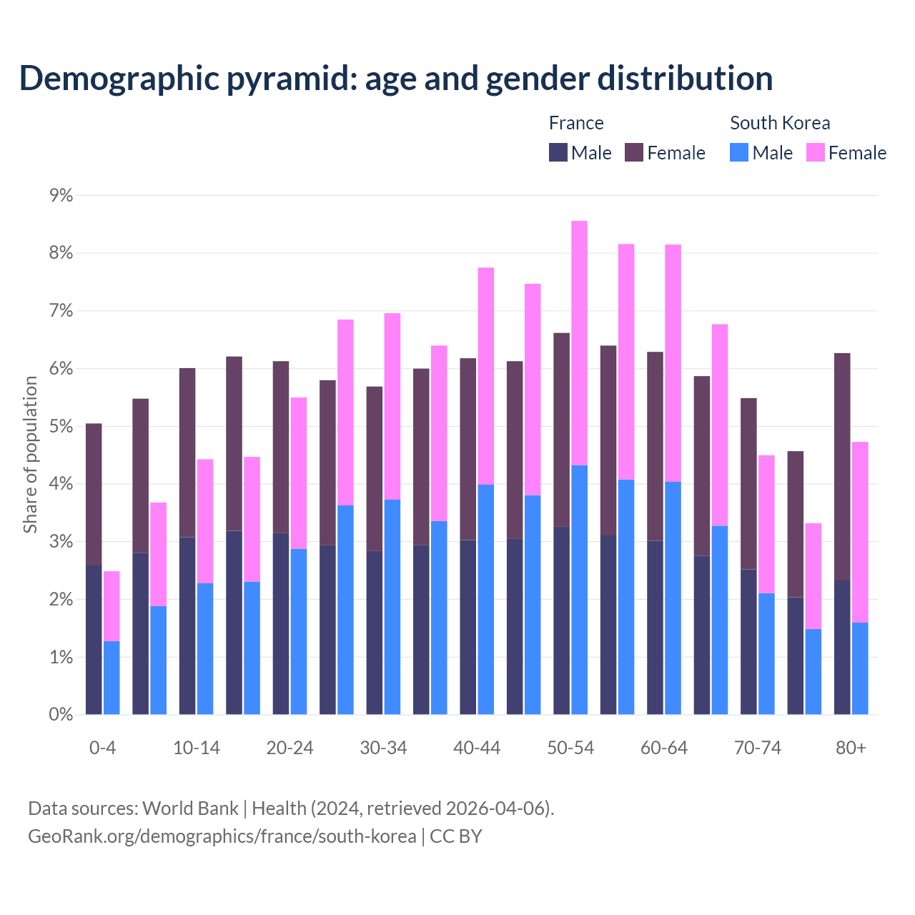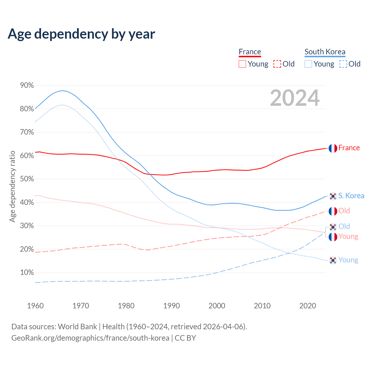 - France is ranked 29/196 by median age (oldest to youngest) vs 10/196 for South Korea.