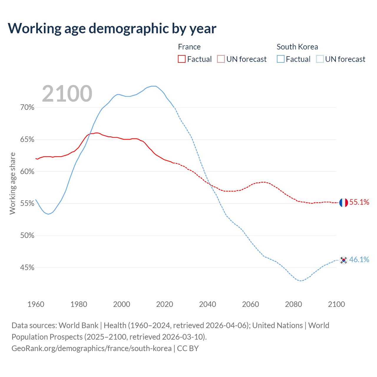 - France has 42.2M working age adults (aged 15-64) vs 36.2M in South Korea.