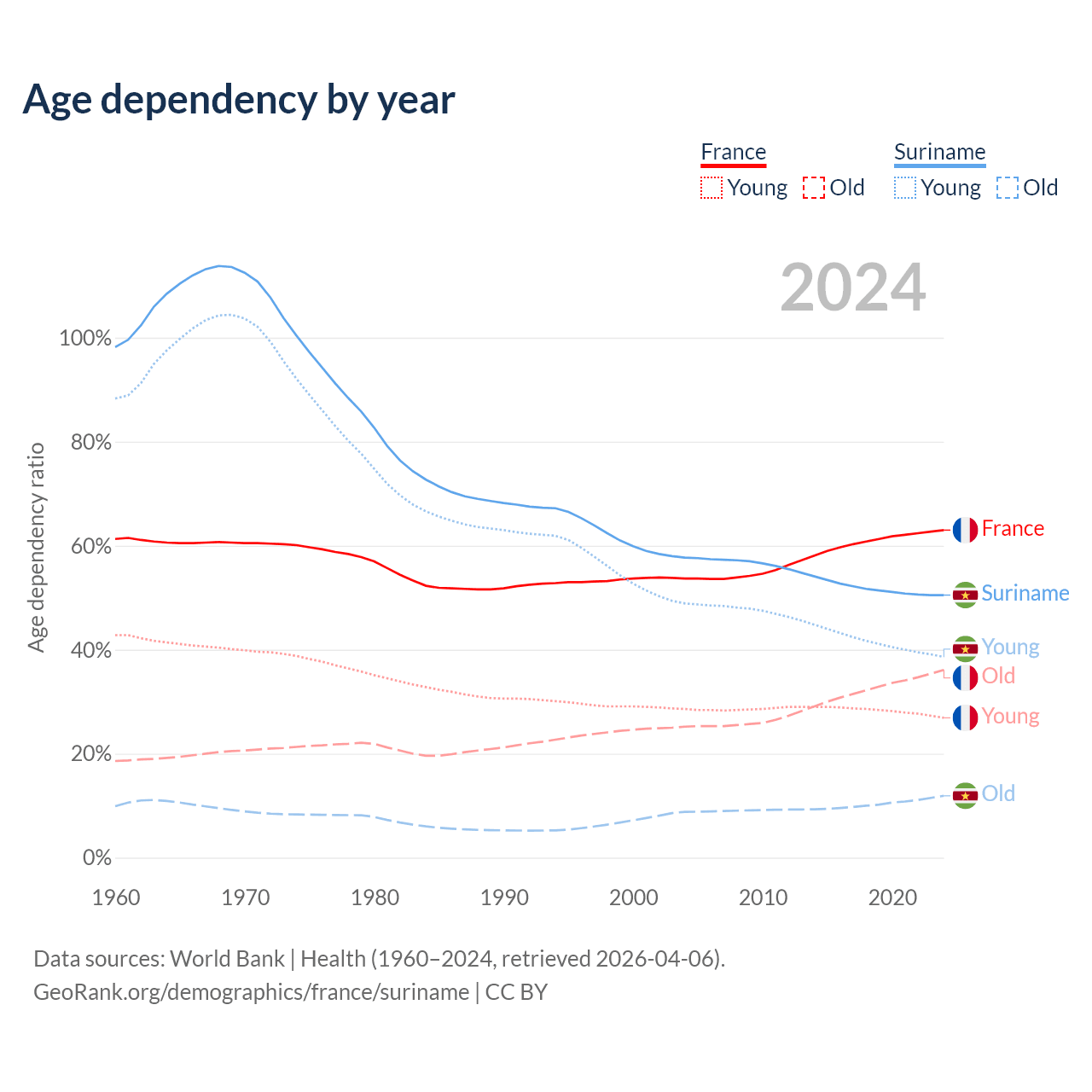 - France is ranked 29/196 by median age (oldest to youngest) vs 109/196 for Suriname.