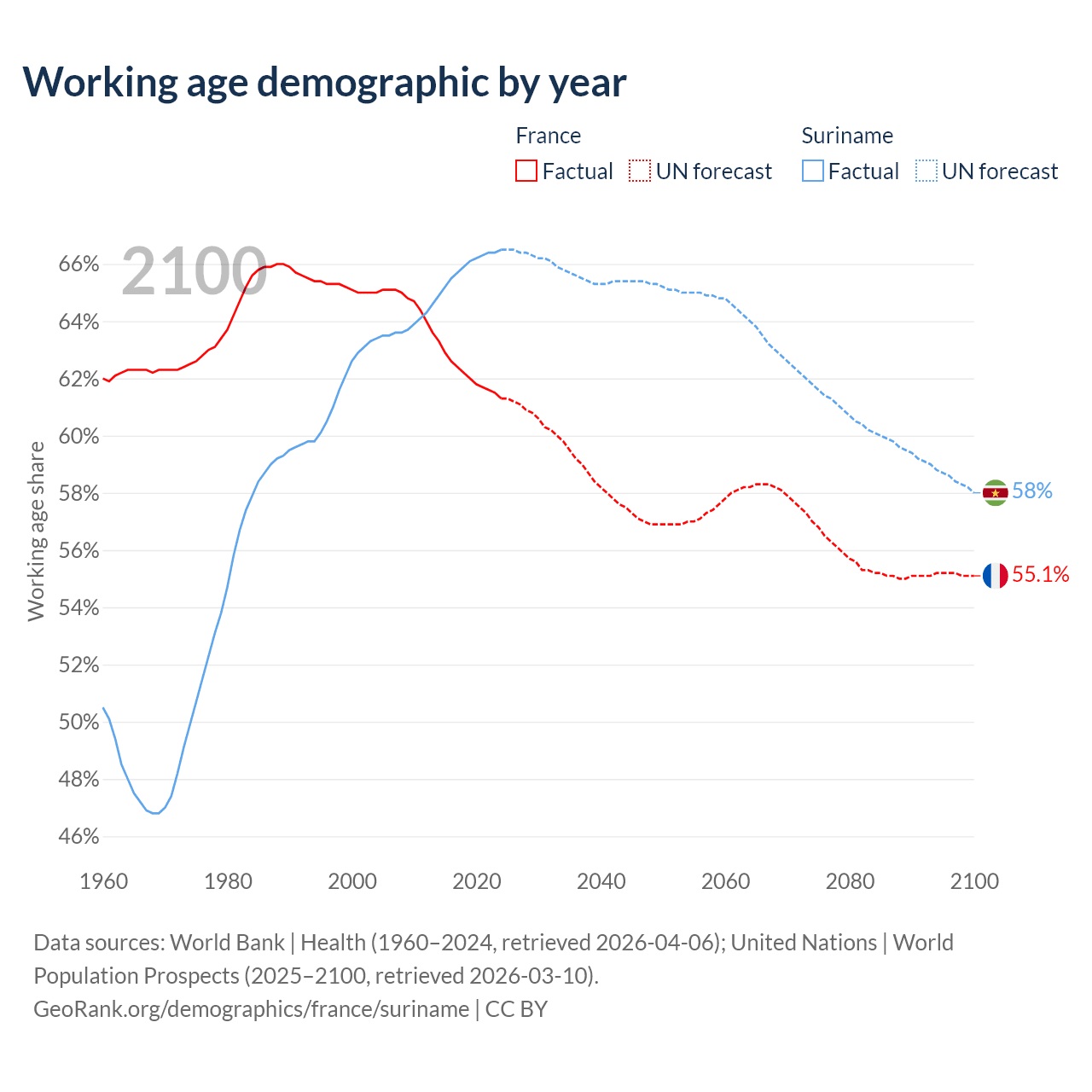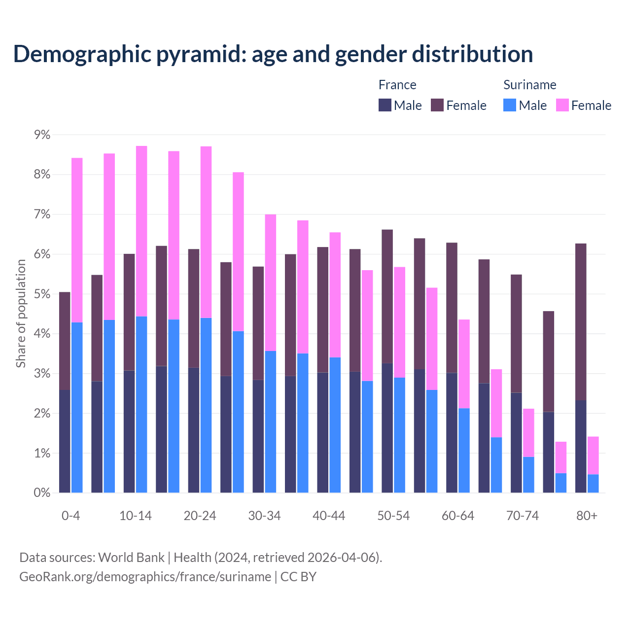 - The share of old-age demographic (65+) in France is 22.1% vs 7.9% in Suriname.