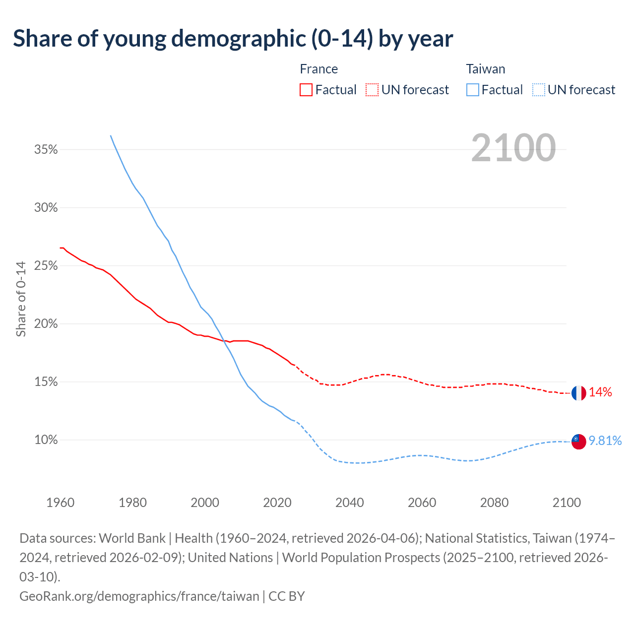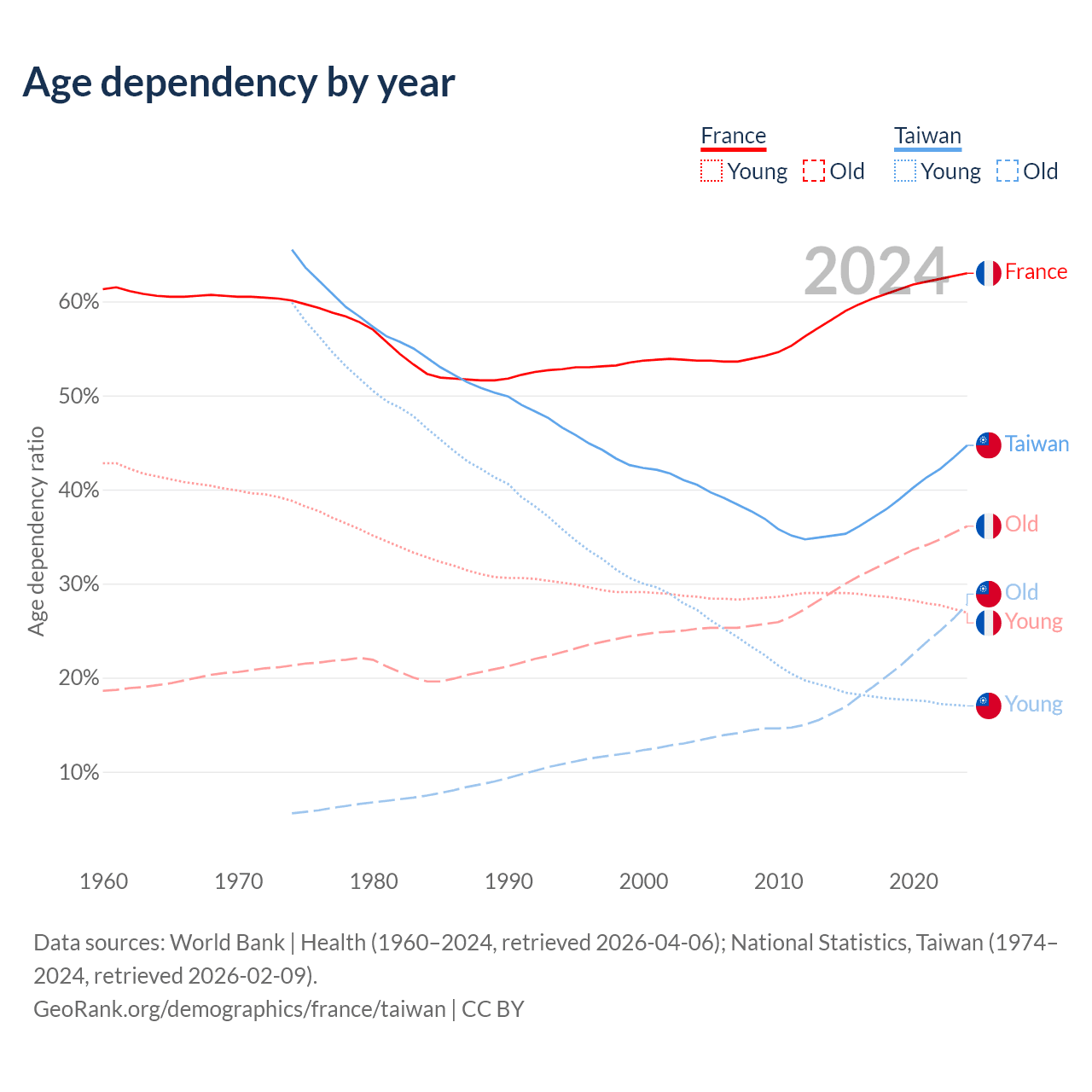 Data sources: World Bank | Health (1960–2024, retrieved 2026-04-06); U.S. Census Bureau (1960–2024, retrieved 2026-02-08); National Statistics, Taiwan (1974–2024, retrieved 2026-02-09).