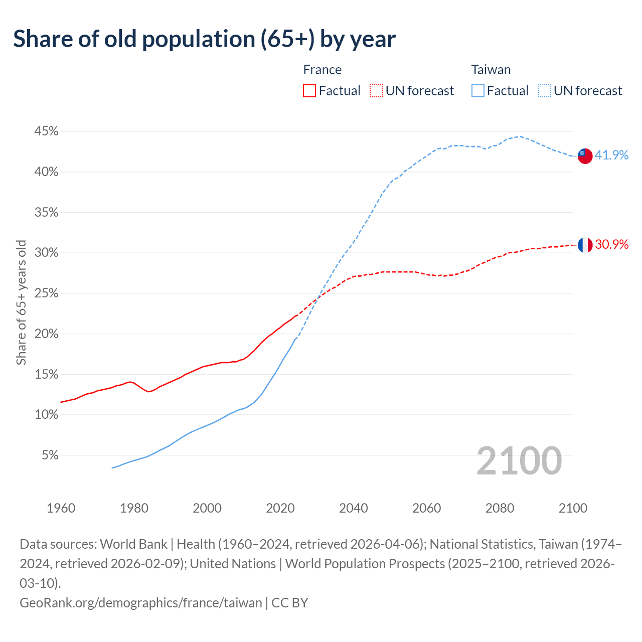 The share of older people aged 65 and over is 22.1% in France and 19.2% in Taiwan. Life expectancy in France compared to Taiwan .
