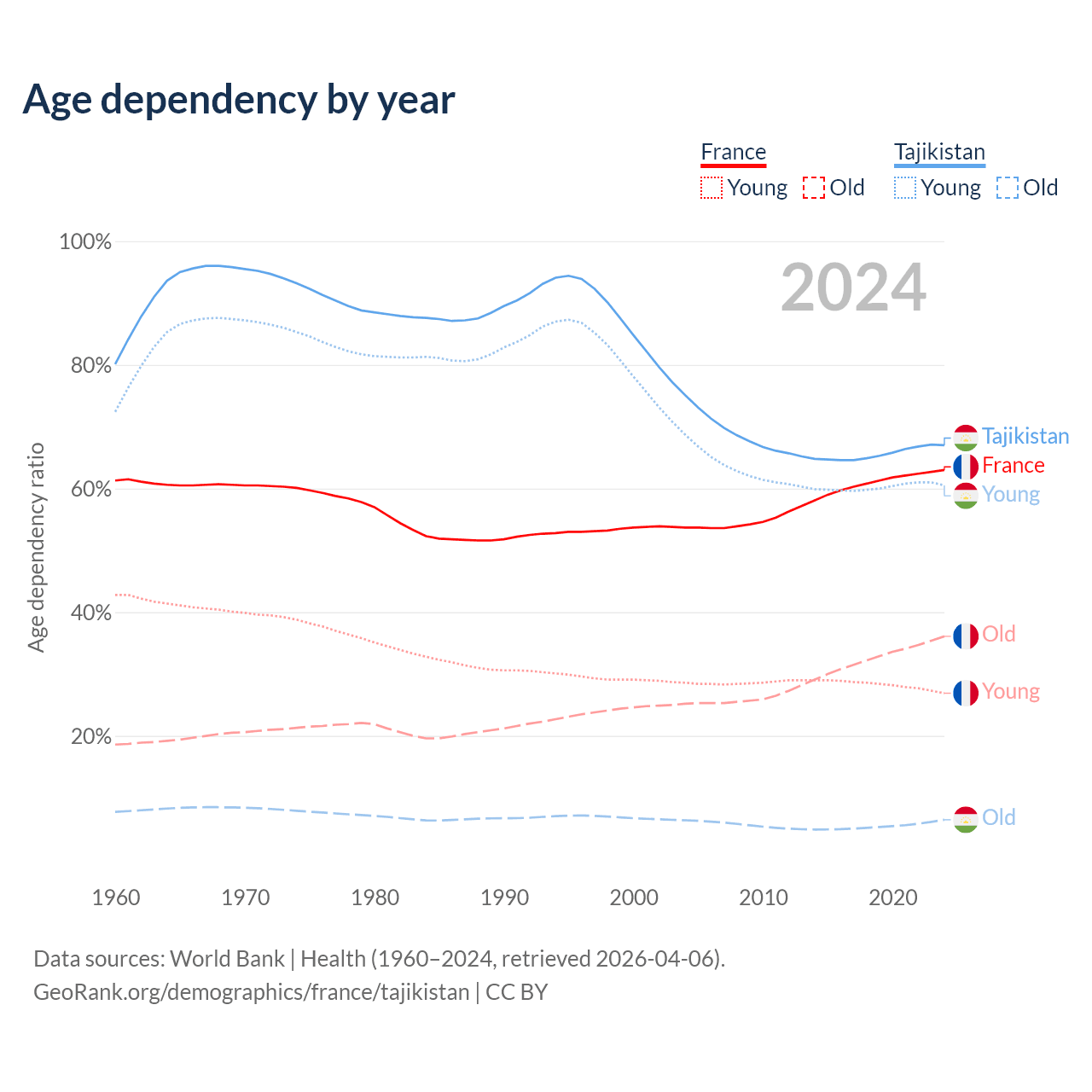 - The share of old-age demographic (65+) in France is 22.1% vs 3.85% in Tajikistan.