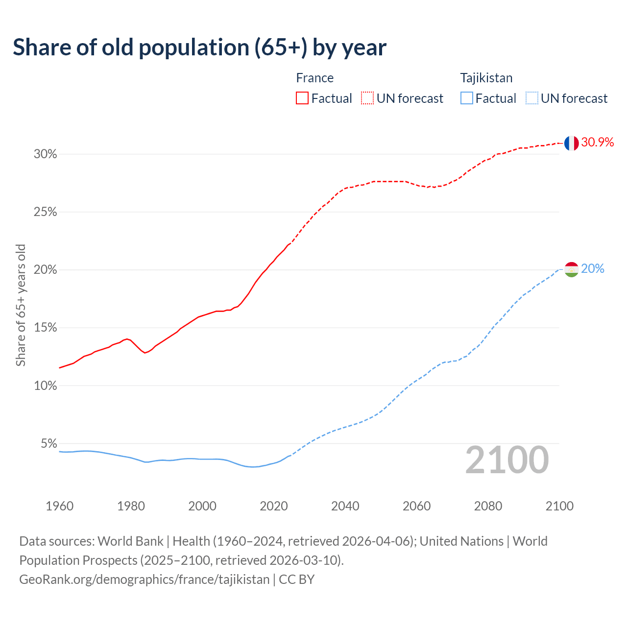 The share of older people aged 65 and over is 22.1% in France and 3.85% in Tajikistan. Life expectancy in France compared to Tajikistan .