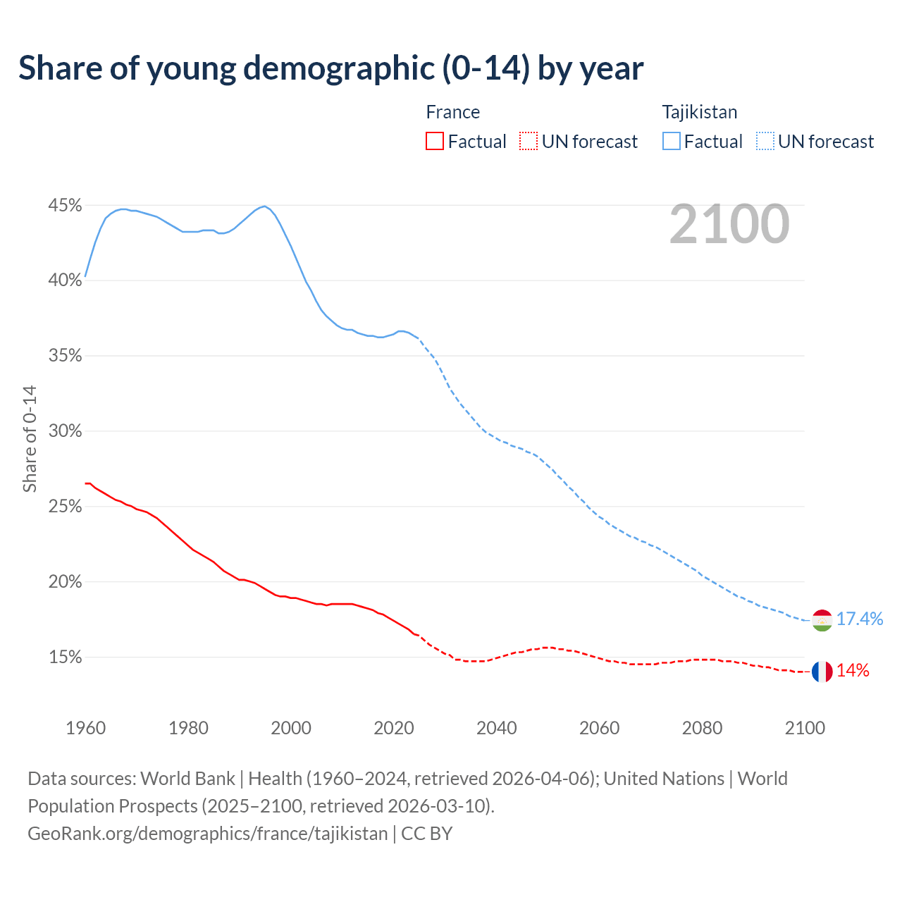 - The share of young demographic (0-15 years old) in France is 16.5% vs 36.3% in Tajikistan.