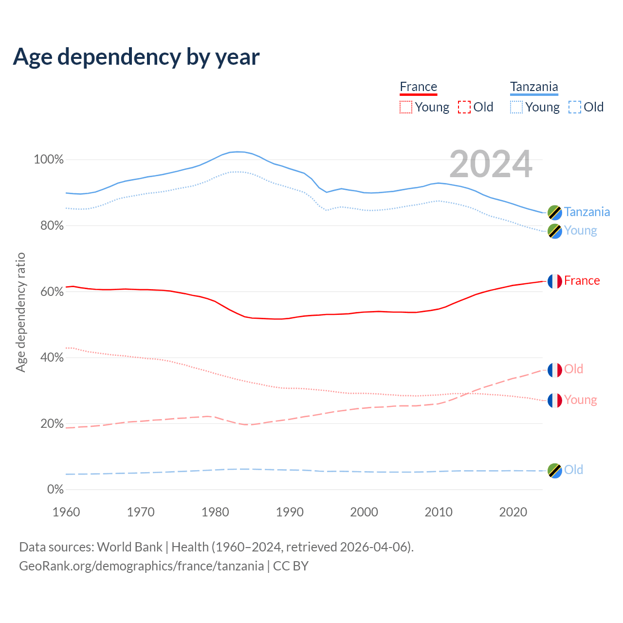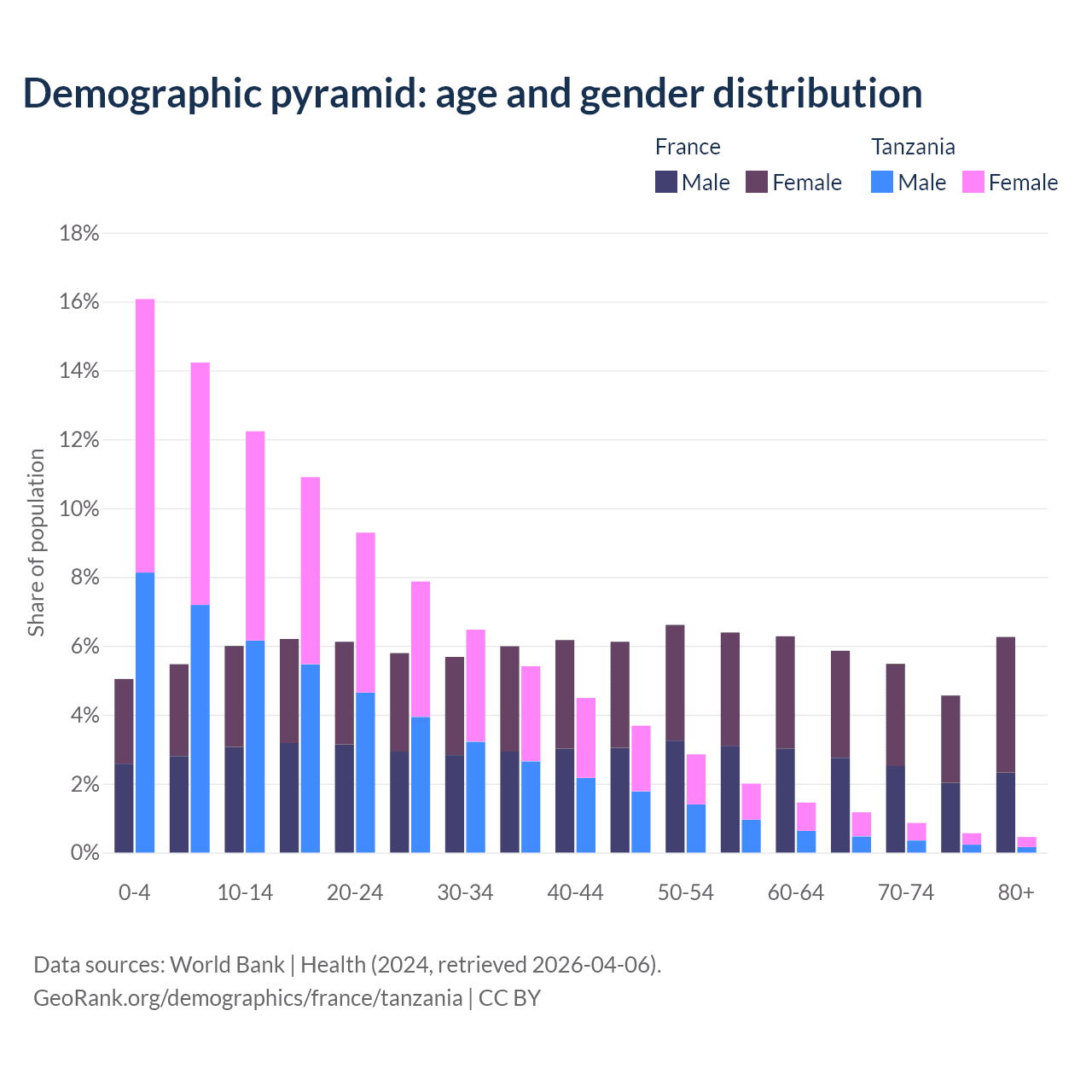 - France is ranked 29/196 by median age (oldest to youngest) vs 184/196 for Tanzania.