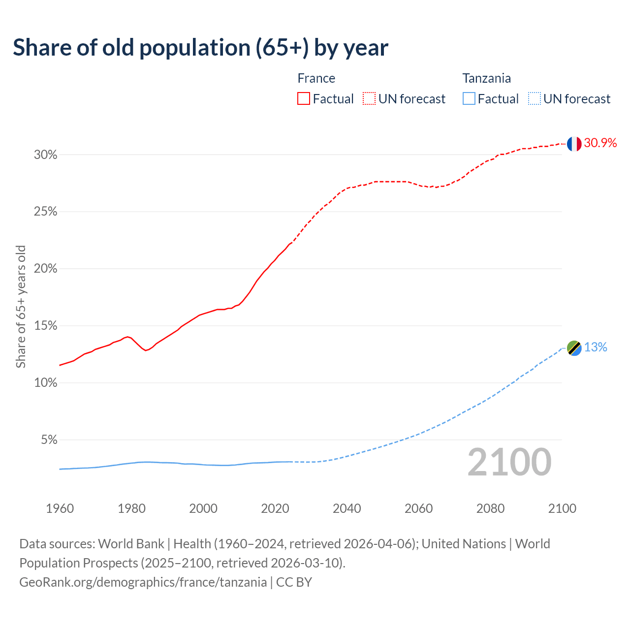 The share of older people aged 65 and over is 22.1% in France and 3.05% in Tanzania. Life expectancy in France compared to Tanzania .