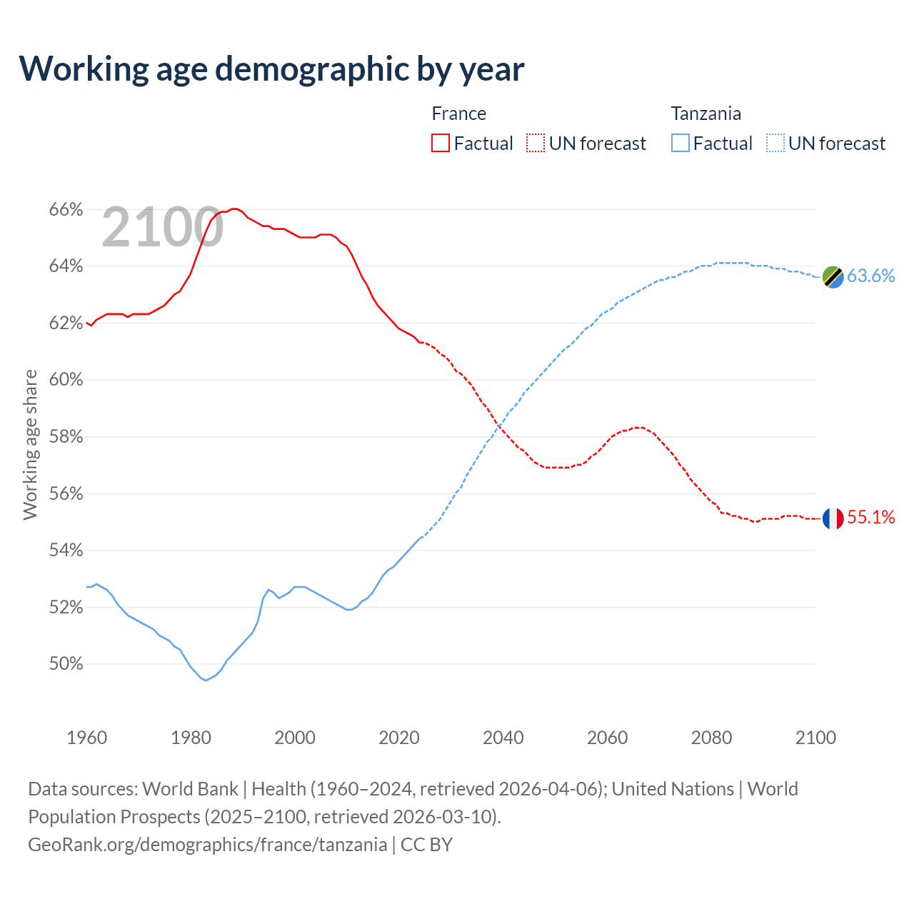 - France has 42.2M working age adults (aged 15-64) vs 39.8M in Tanzania.