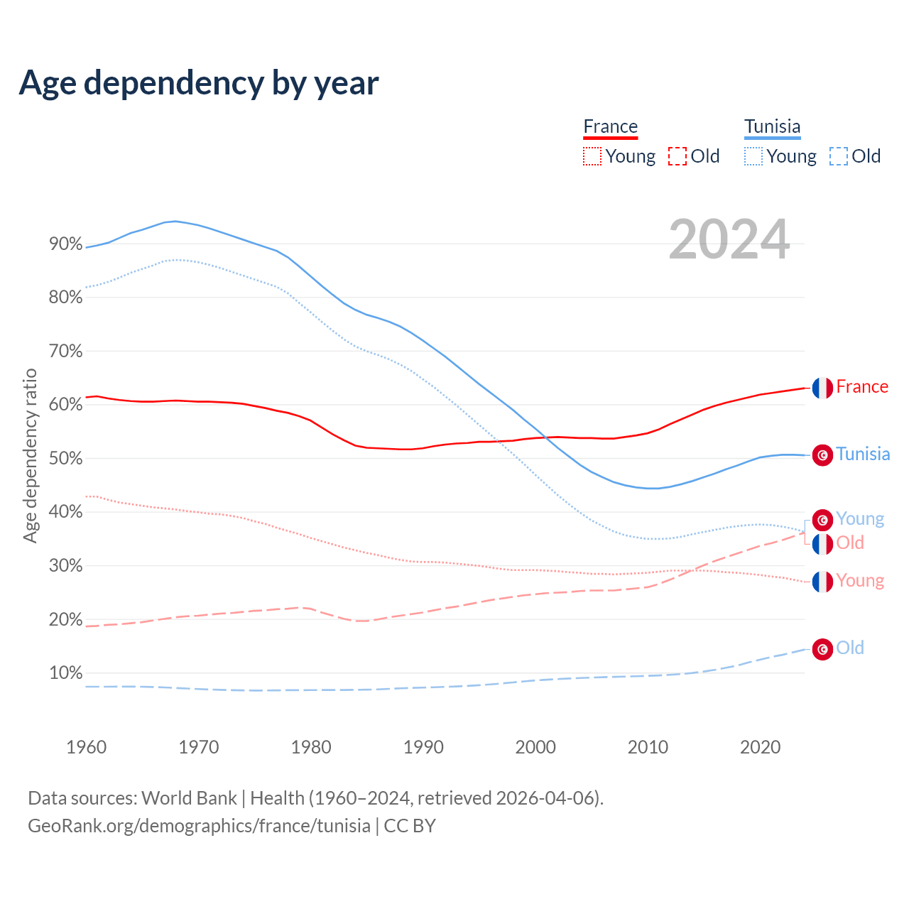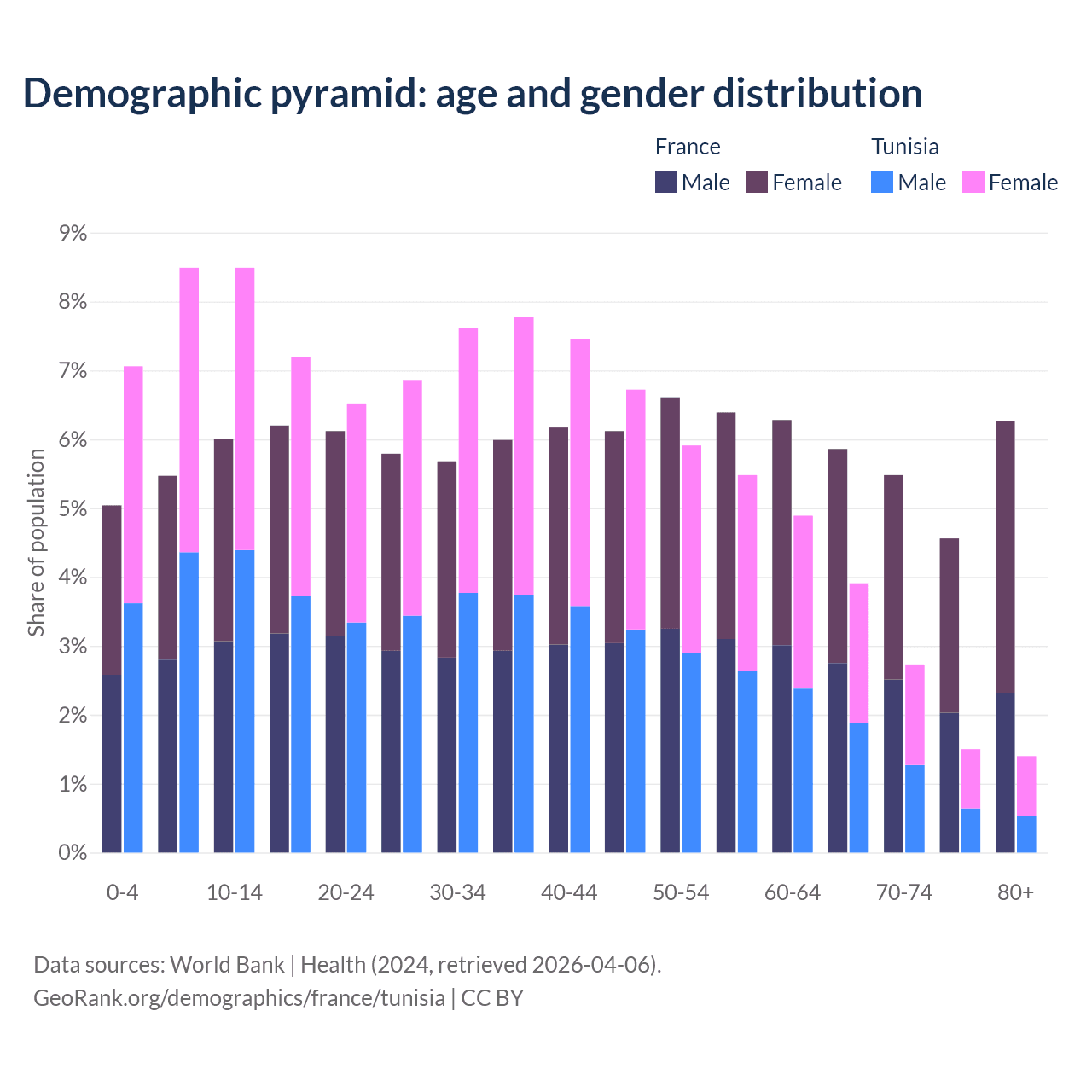- France is ranked 29/196 by median age (oldest to youngest) vs 86/196 for Tunisia.
