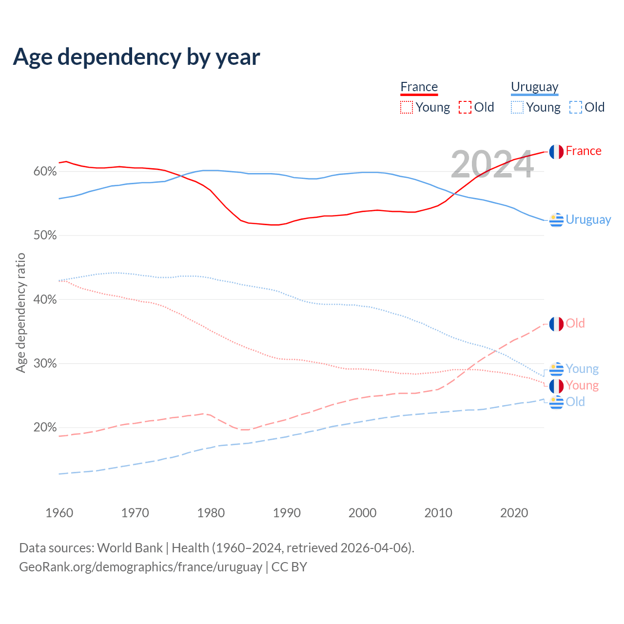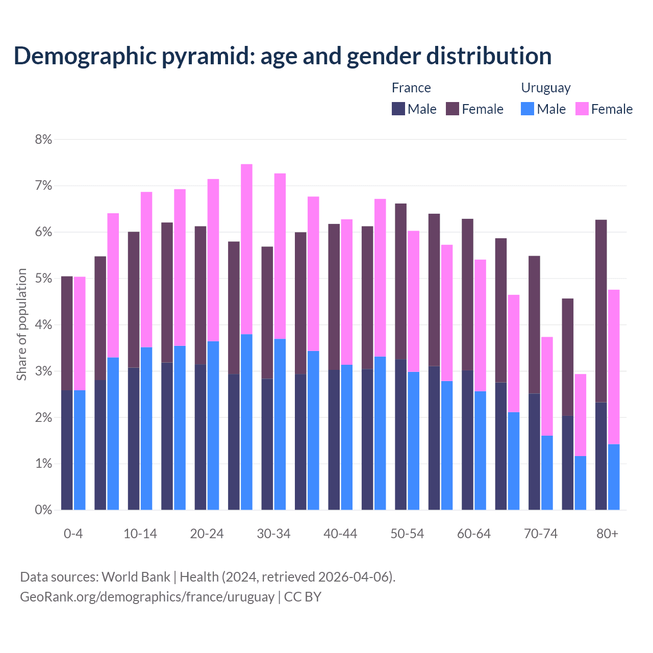 - France is ranked 29/196 by median age (oldest to youngest) vs 63/196 for Uruguay.