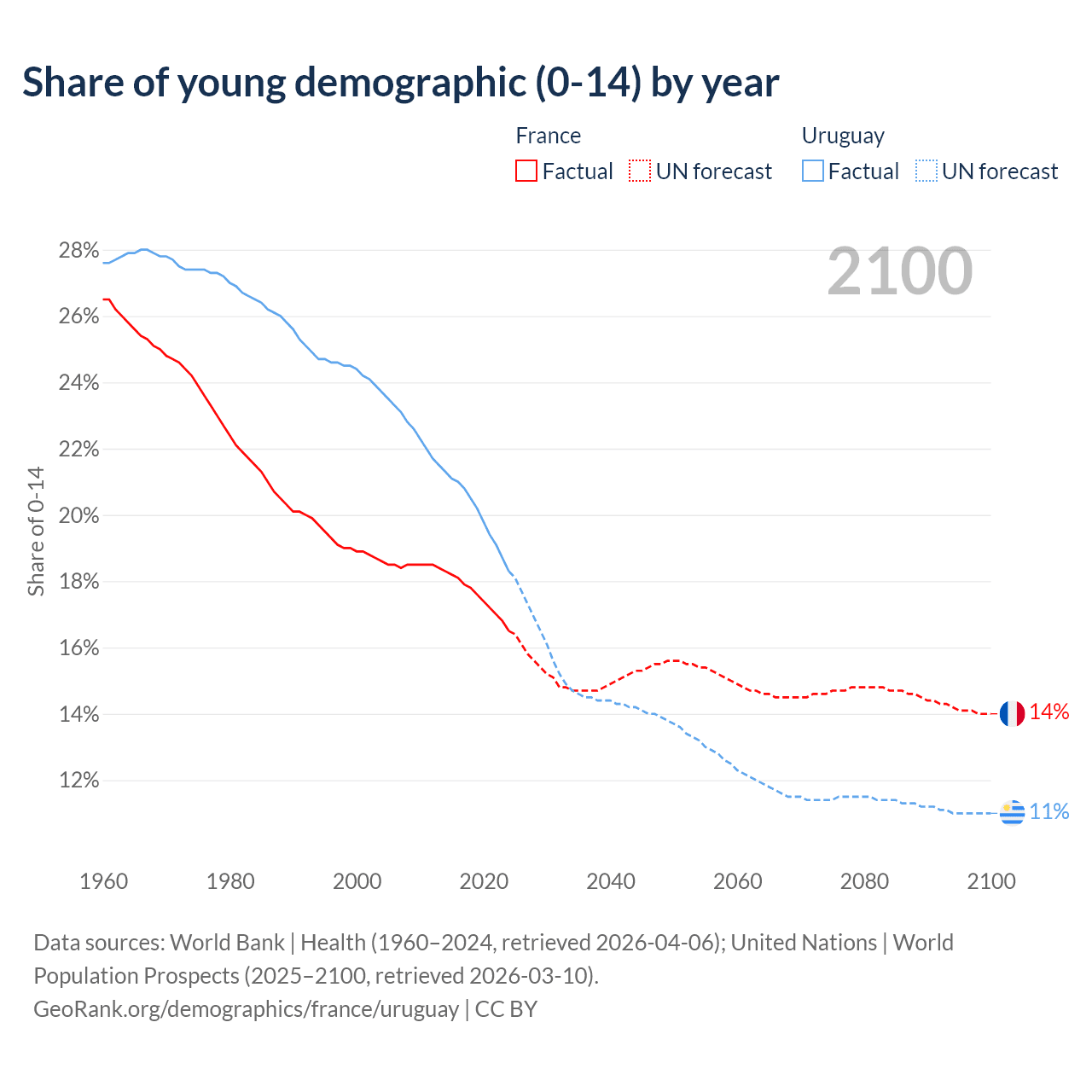 - The share of young demographic (0-15 years old) in France is 16.5% vs 18.3% in Uruguay.
