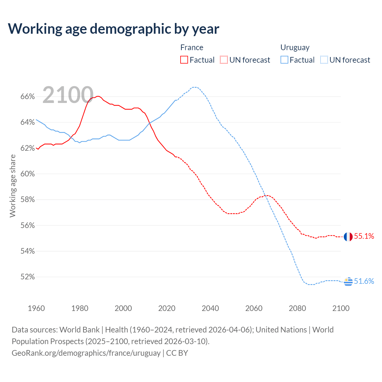 - France has 42.2M working age adults (aged 15-64) vs 2.22M in Uruguay.