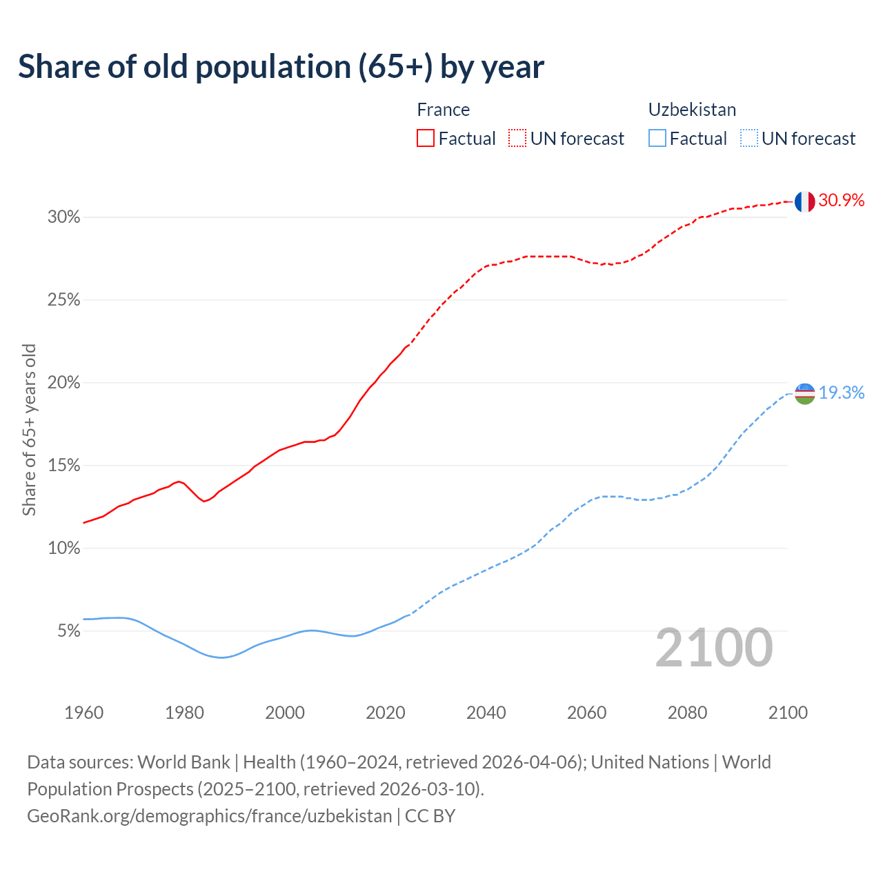 - The share of old-age demographic (65+) in France is 22.1% vs 5.86% in Uzbekistan.