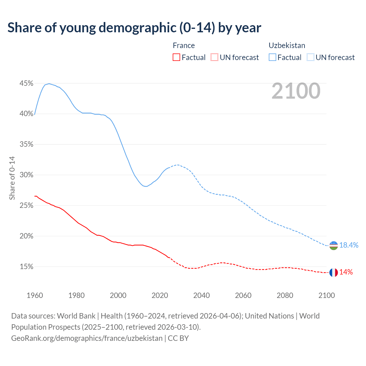 - The share of young demographic (0-15 years old) in France is 16.5% vs 31.1% in Uzbekistan.