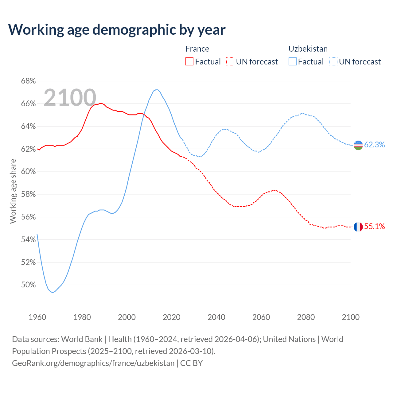 - France has 42.2M working age adults (aged 15-64) vs 23.9M in Uzbekistan.