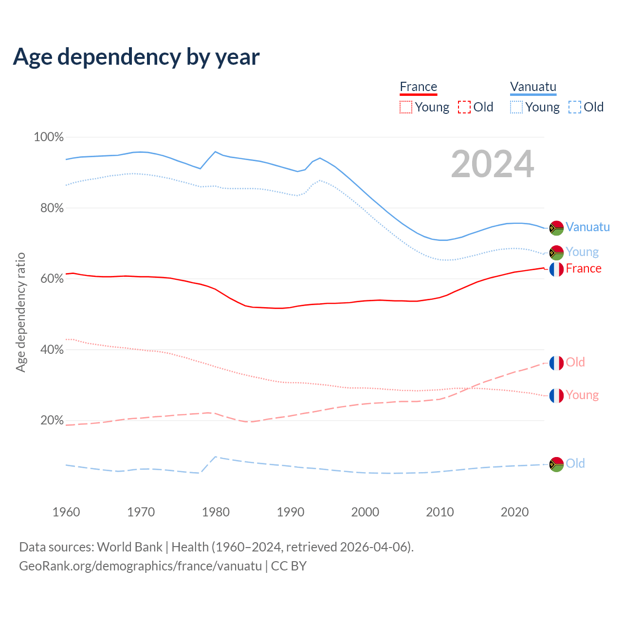- France is ranked 29/196 by median age (oldest to youngest) vs 156/196 for Vanuatu.