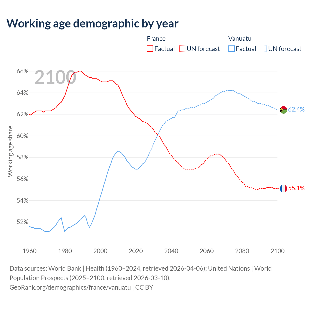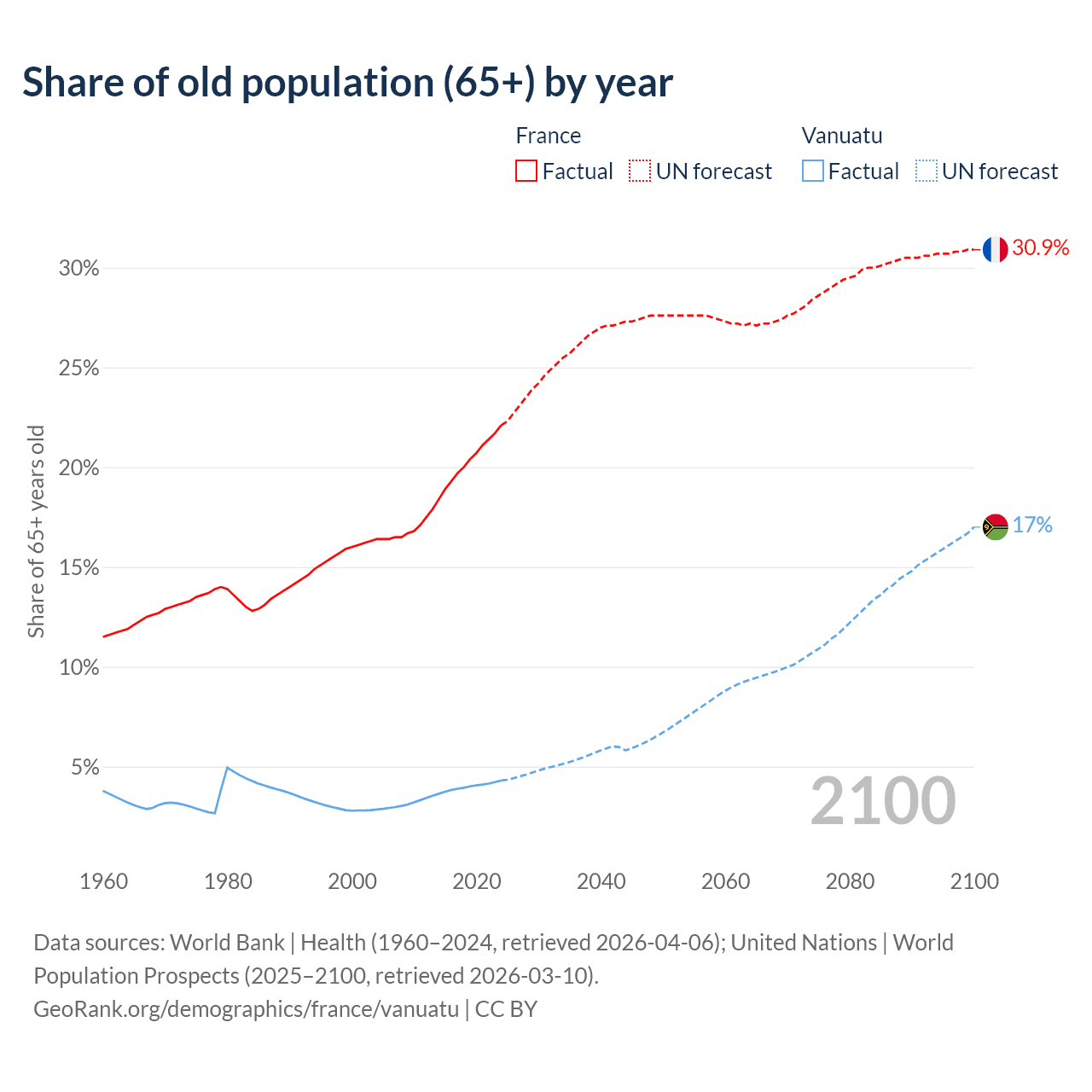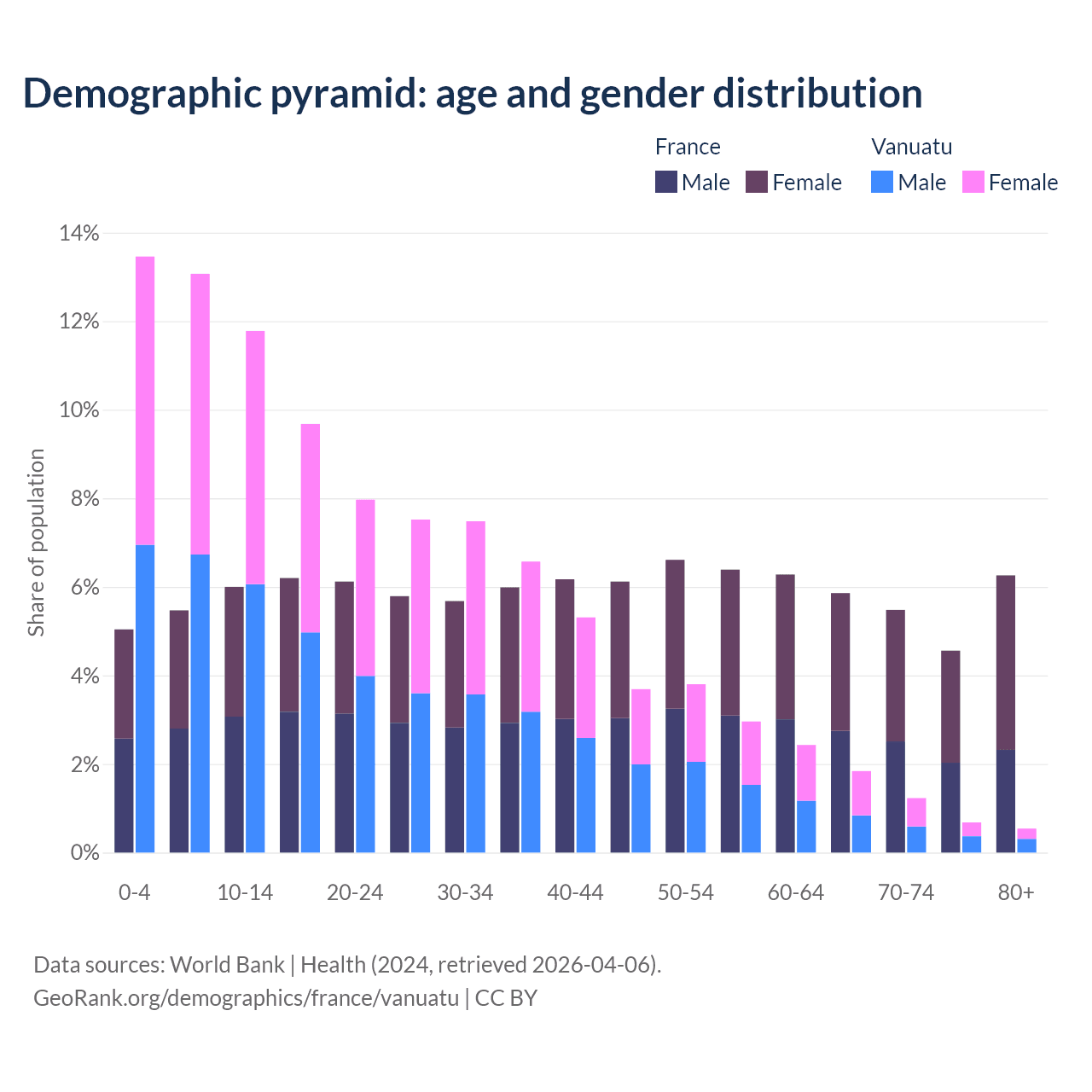 - The share of old-age demographic (65+) in France is 22.1% vs 4.3% in Vanuatu.