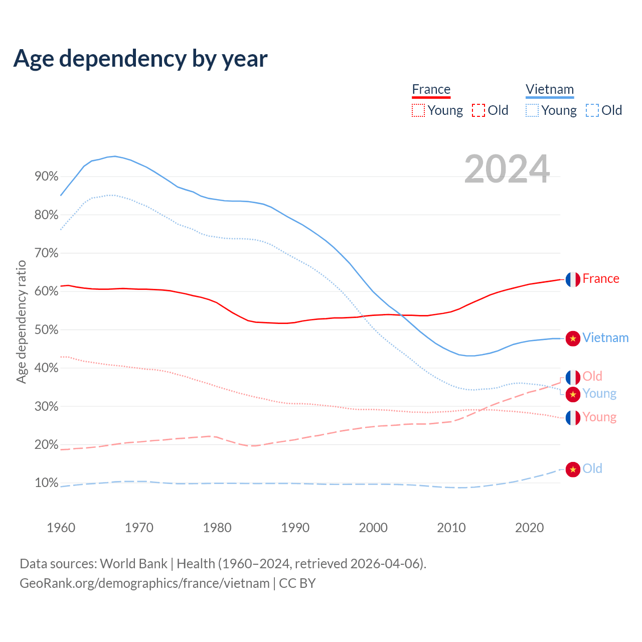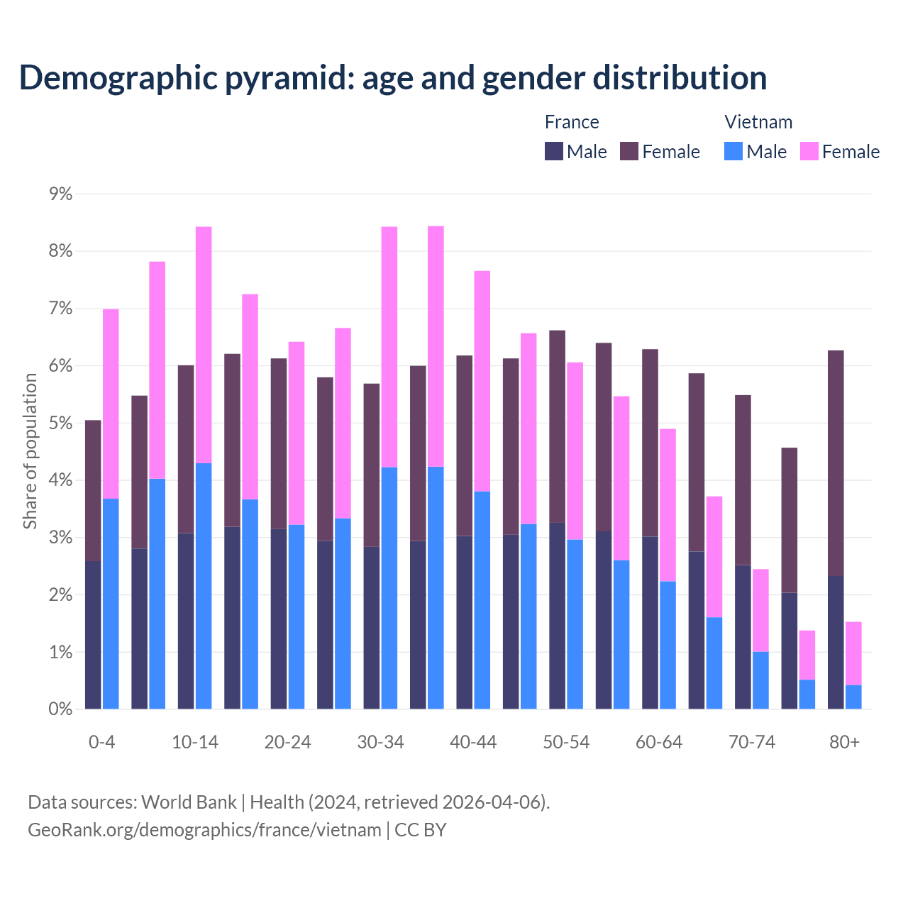 - France is ranked 29/196 by median age (oldest to youngest) vs 84/196 for Vietnam.