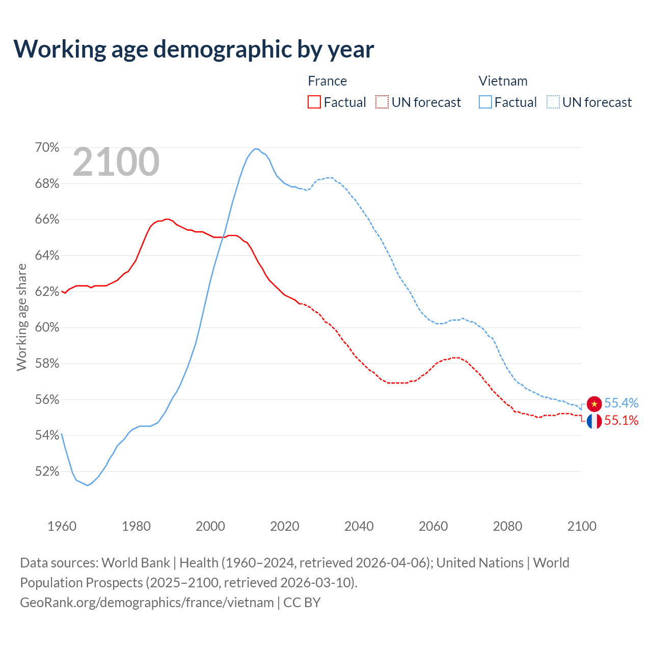 - France has 42.2M working age adults (aged 15-64) vs 69.3M in Vietnam.
