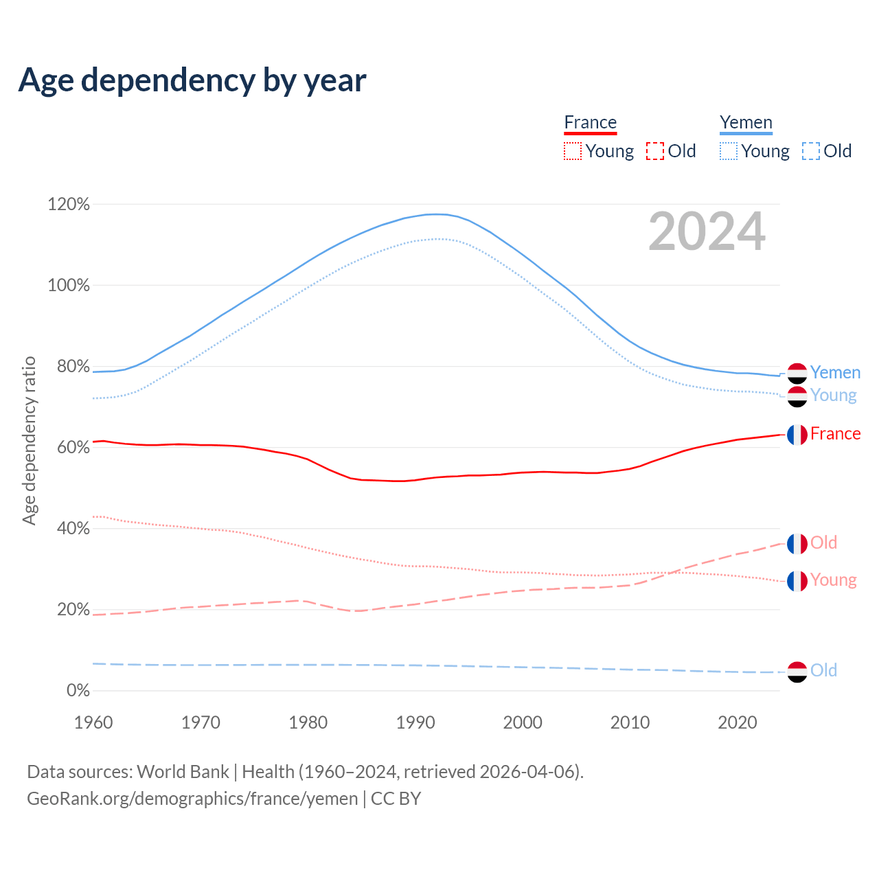 - France is ranked 29/196 by median age (oldest to youngest) vs 174/196 for Yemen.