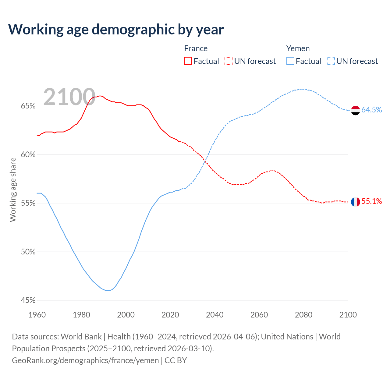 - France has 42.2M working age adults (aged 15-64) vs 24.4M in Yemen.