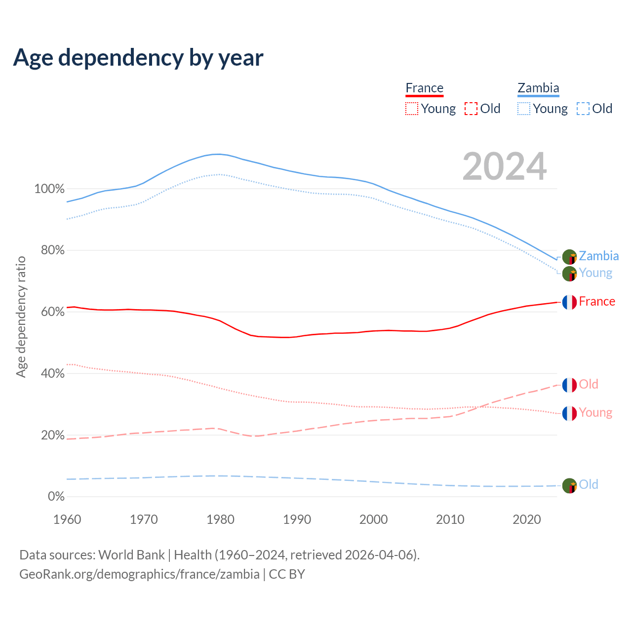 - France is ranked 29/196 by median age (oldest to youngest) vs 182/196 for Zambia.