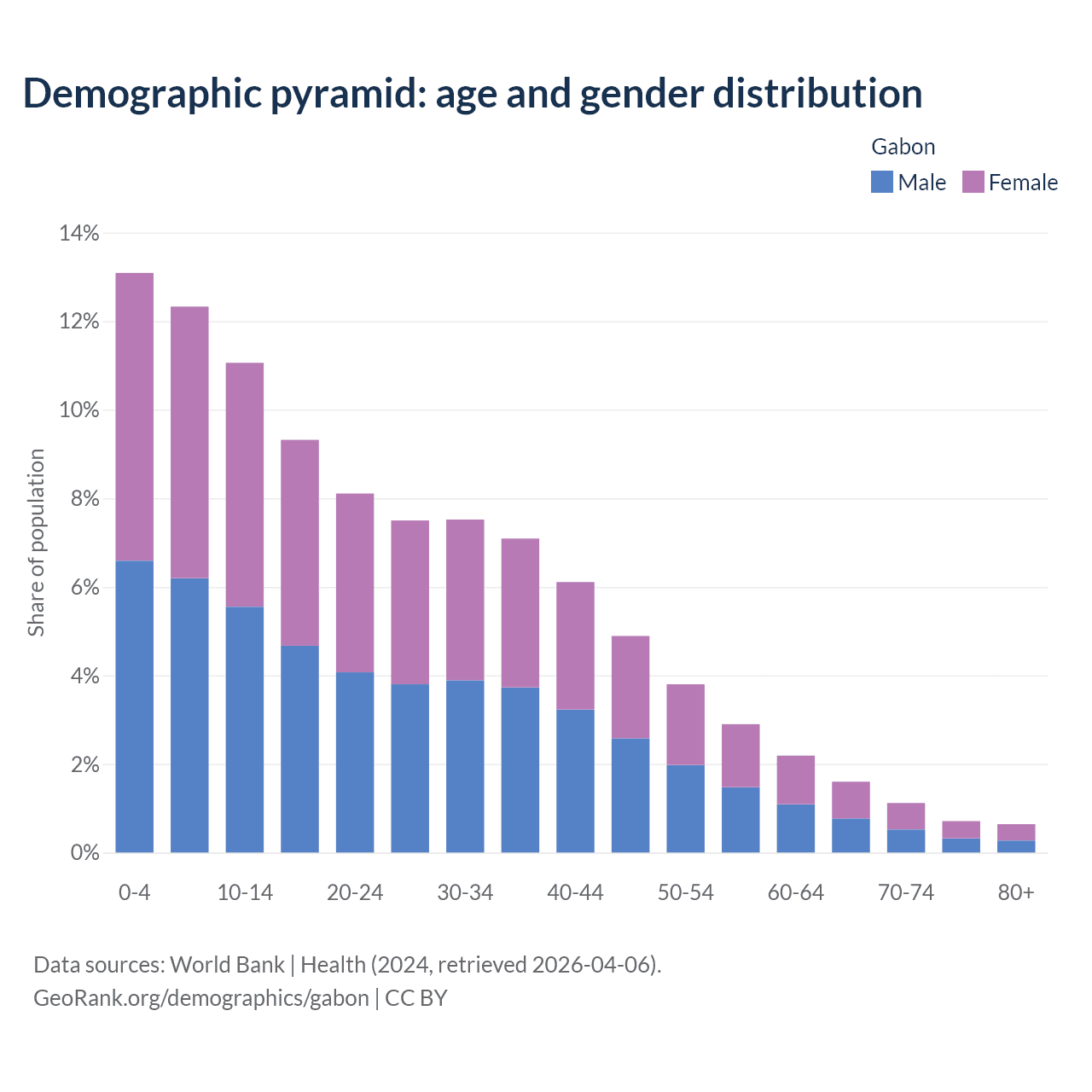 With a population of 2.54M people, Gabon has a median age of 22.6 years which makes it the 144/196 oldest country. 36.5% of the demographic are children 0-14 years old, 59.4% are working-age people aged 15-64, and 4.08% are older population aged 65+ years.