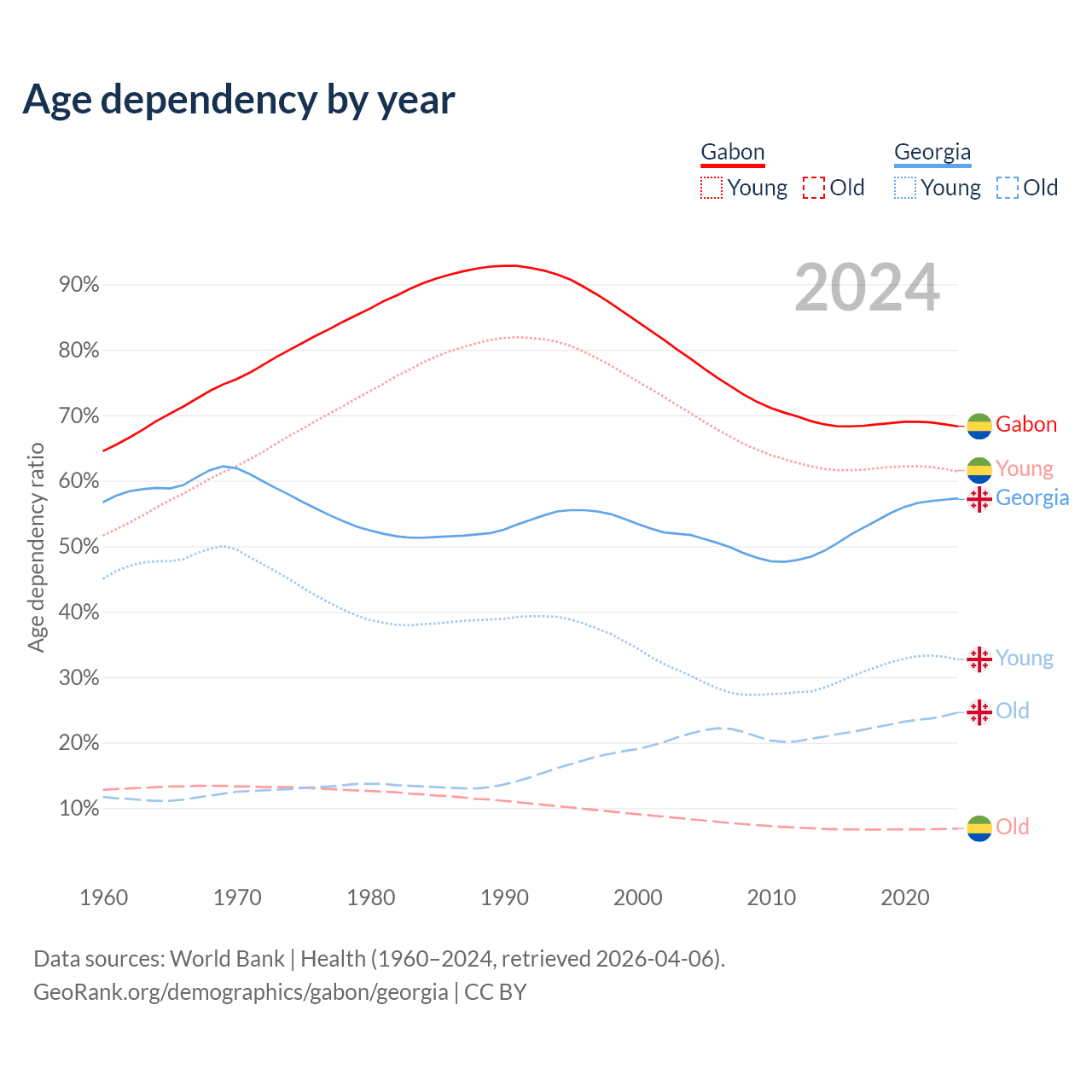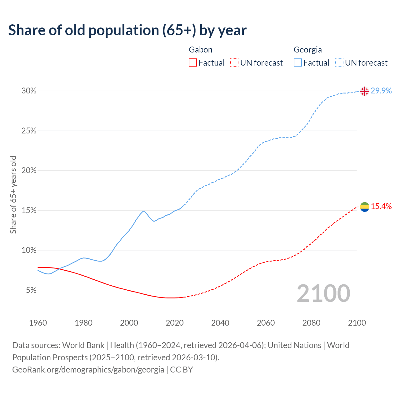 The share of older people aged 65 and over is 4.08% in Gabon and 15.6% in Georgia. Life expectancy in Gabon compared to Georgia .
