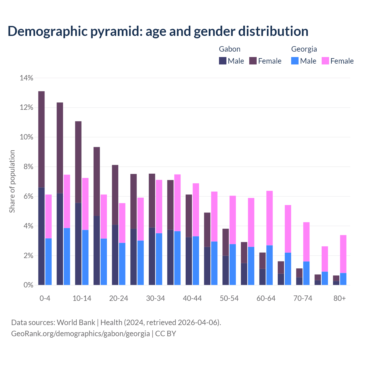 - Gabon is ranked 144/196 by median age (oldest to youngest) vs 59/196 for Georgia.