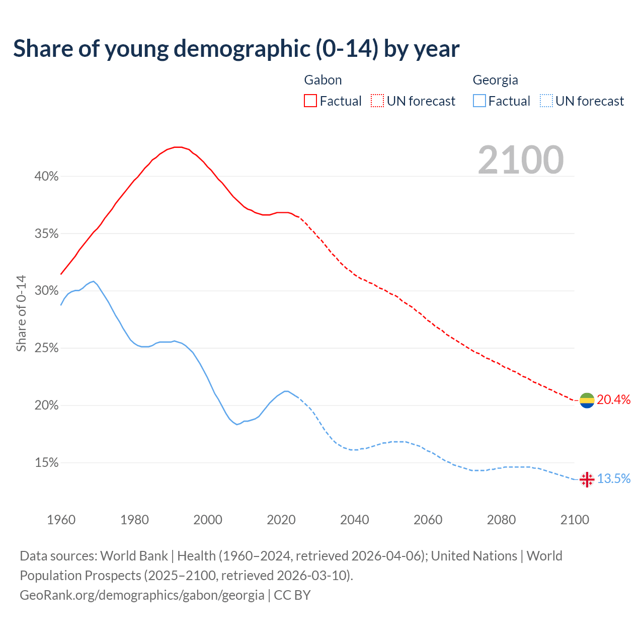 - The share of young demographic (0-15 years old) in Gabon is 36.5% vs 20.8% in Georgia.