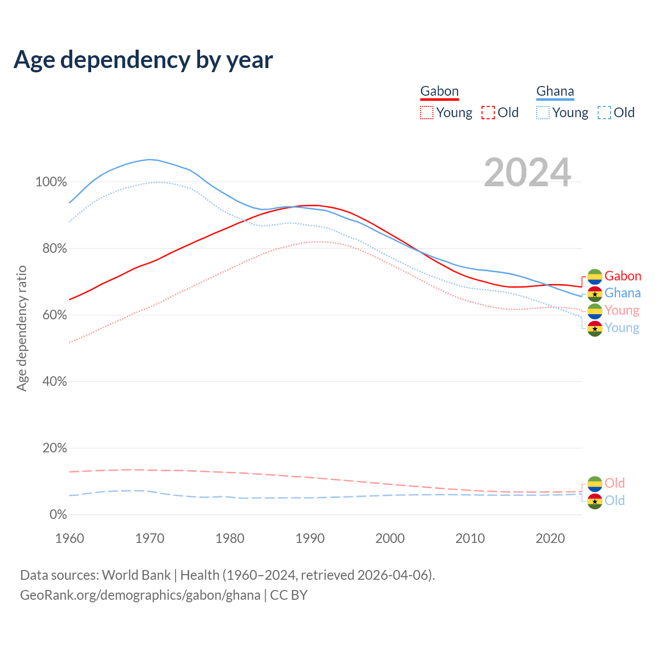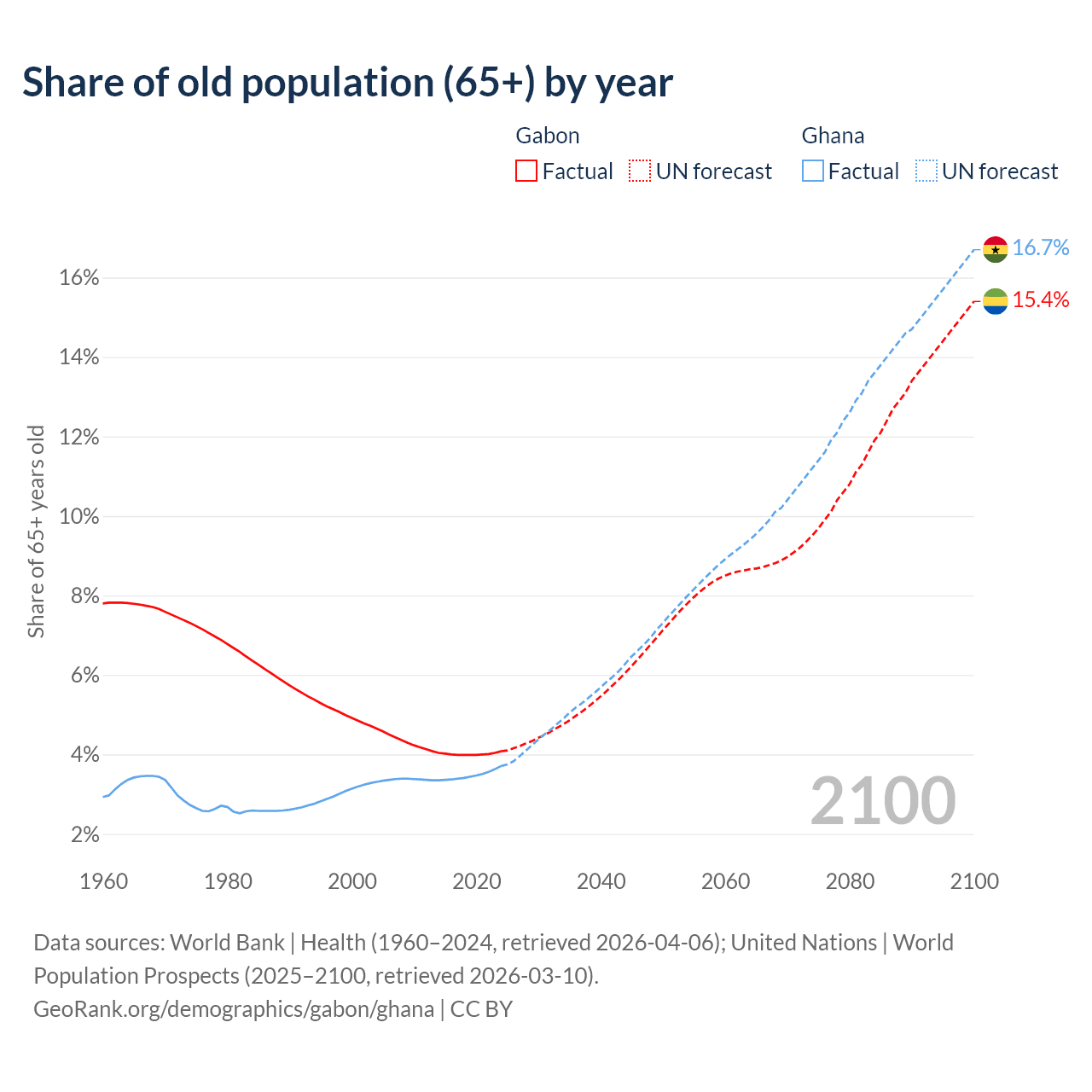 The share of older people aged 65 and over is 4.08% in Gabon and 3.71% in Ghana. Life expectancy in Gabon compared to Ghana .
