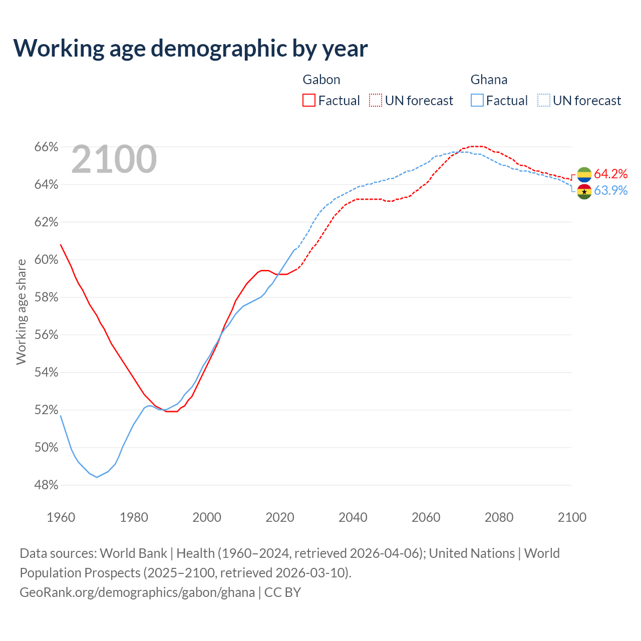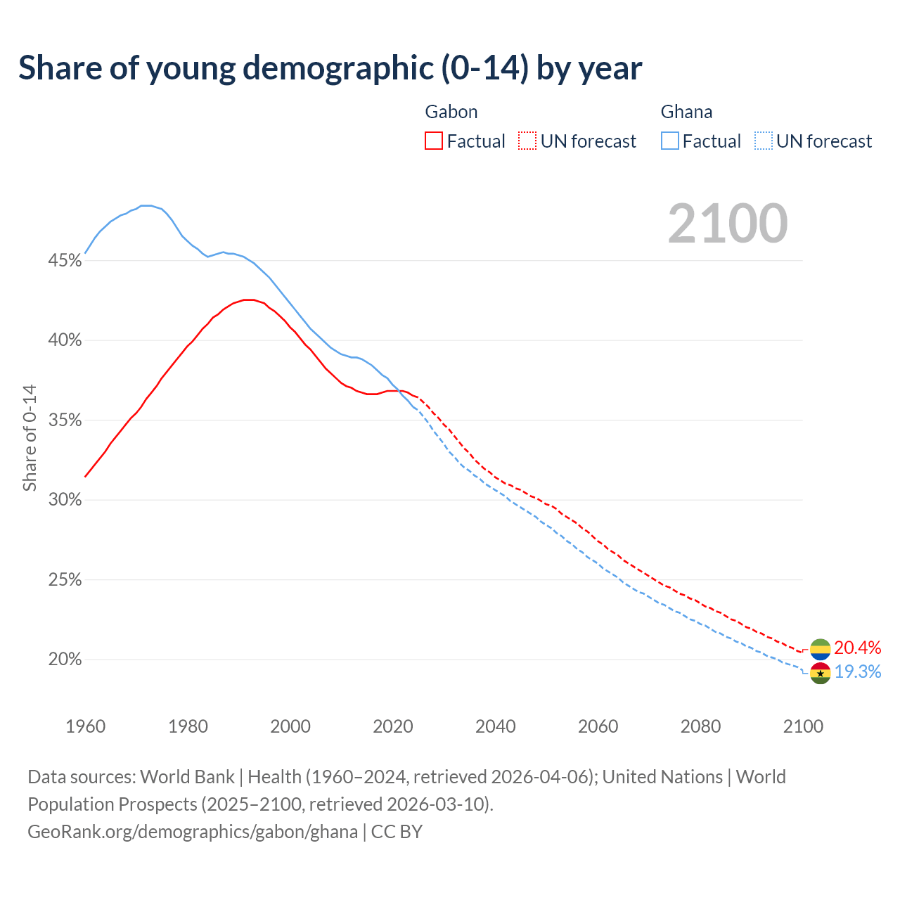 Median age Gabon vs Ghana, 1960-2100